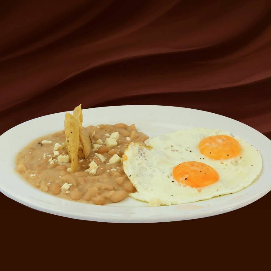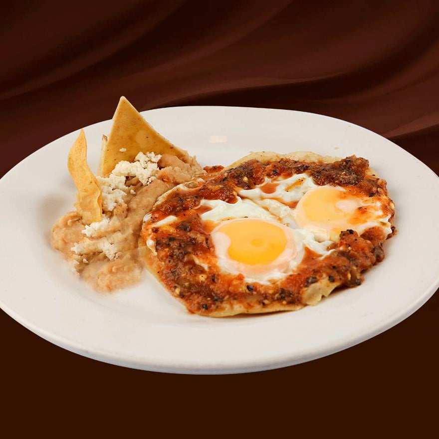 Dos huevos estrellados sobre tortilla frita bañados con deliciosa salsa ranchera, acompañados con frijoles refritos. Con tres tortillas de comal hechas a mano.