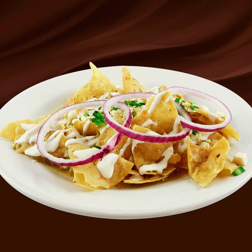 Totopos de la casa bañados en salsa de tu preferencia, acompañados de cebolla morada, frijoles refritos, queso fresco y crema.