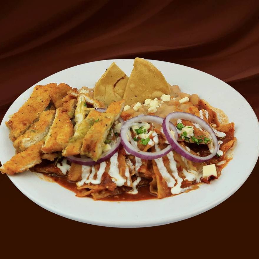 Totopos de la casa bañados en salsa de tu preferencia, acompañados con milanesa 130 gr, cebolla, frijoles refritos, queso fresco y crema.