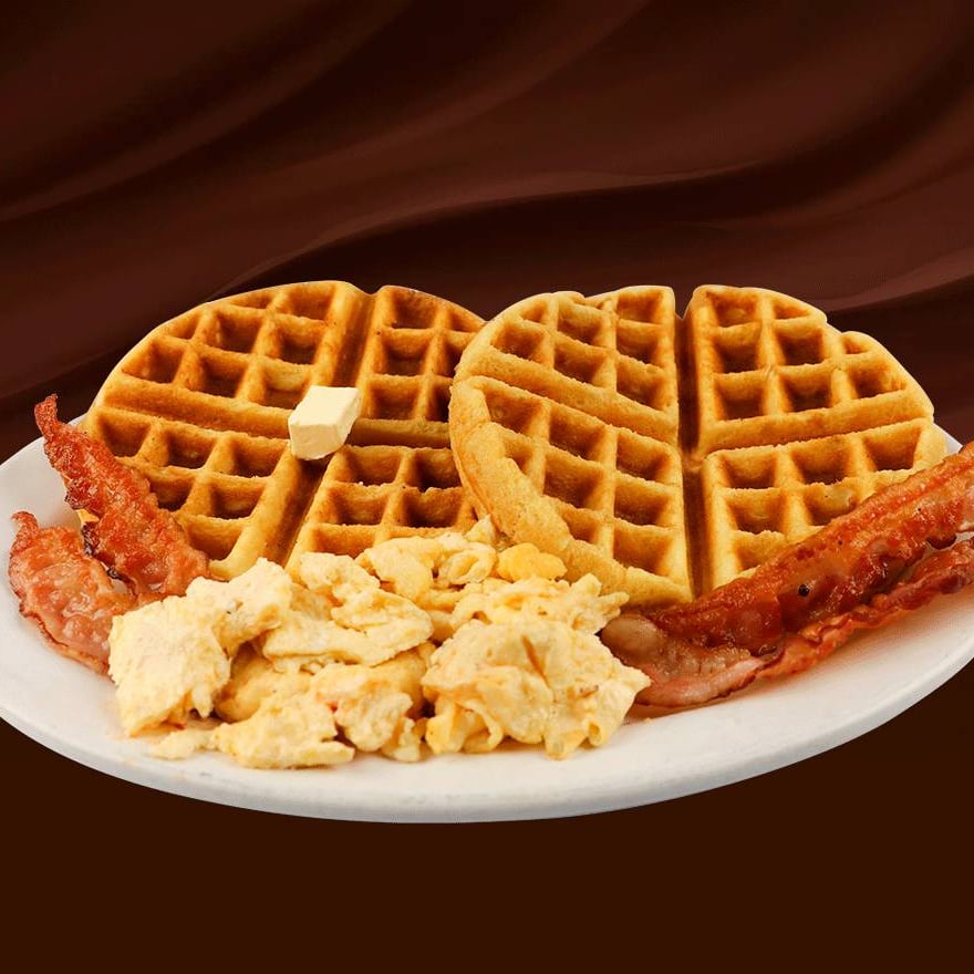 Dos waffles recien hechos, acompañados con dos huevos revueltos y tocino en tiras, mantequilla y miel maple.