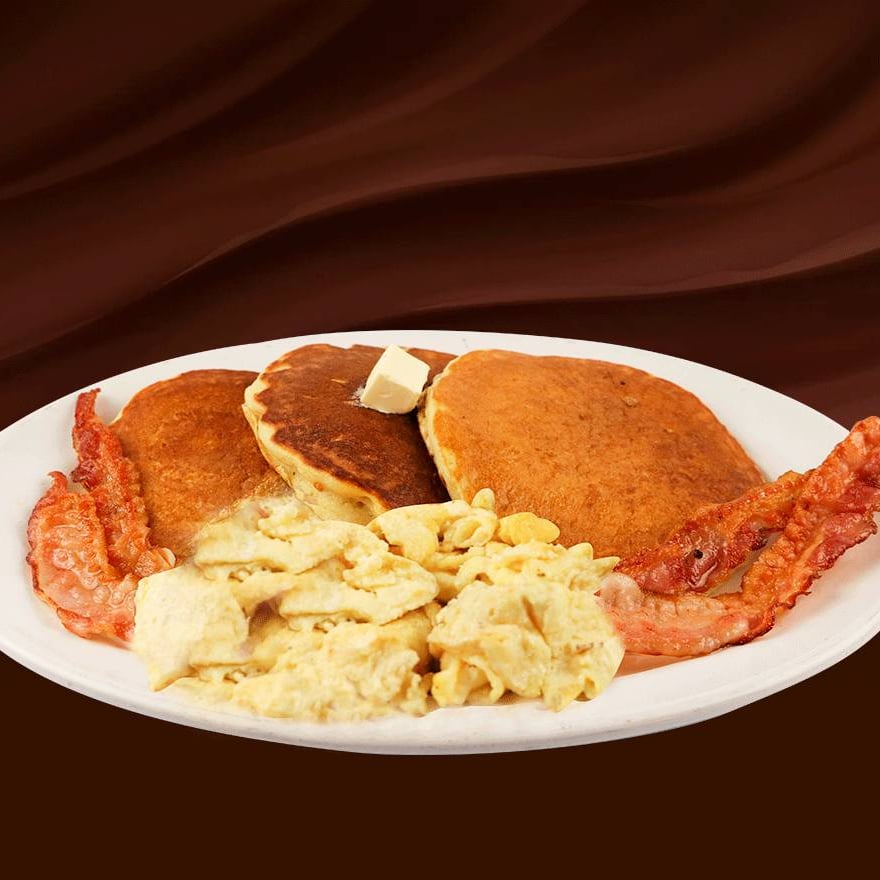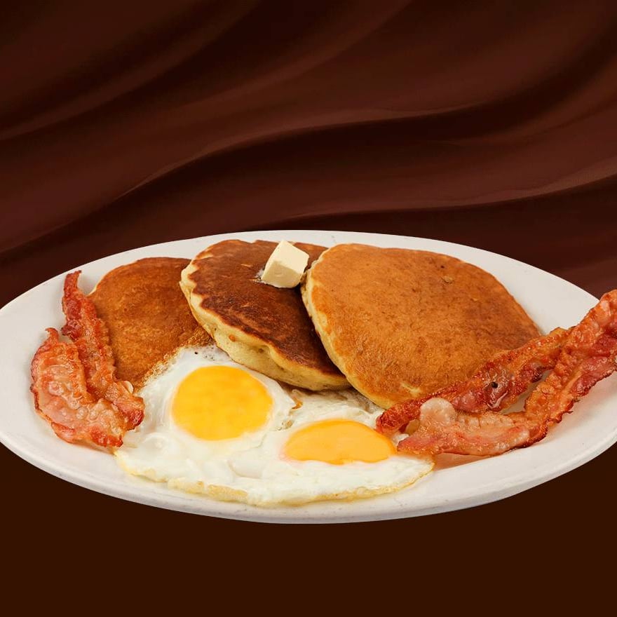 Tres hot cakes recien hechos, acompañados con dos huevos revueltos y tocino en tiras, mantequilla y miel maple.