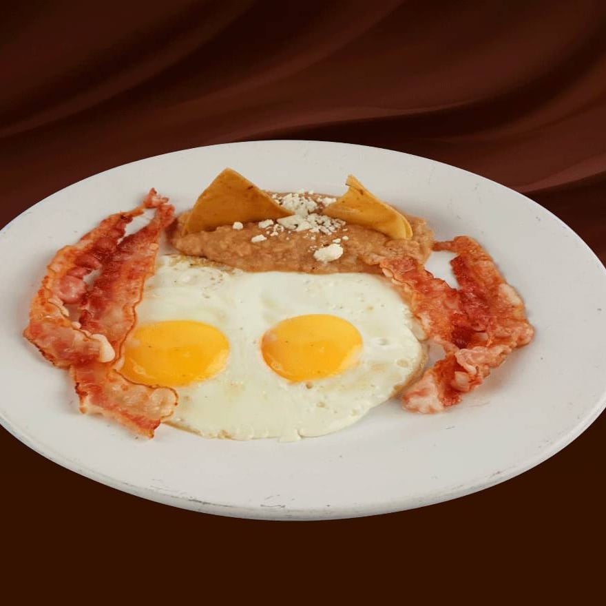 Dos huevos estrellados con tocino en tiras, acompañado de frijoles refritos. Con tres tortillas de comal hechas a mano.
