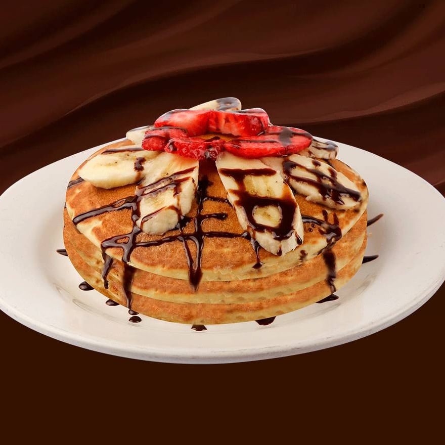 Dos hot cakes esponjosos preparados con nuestra deliciosa pasta de la casa, acompañado con plátano y fresa bañados en chocolate o mermelada, o miel maple.