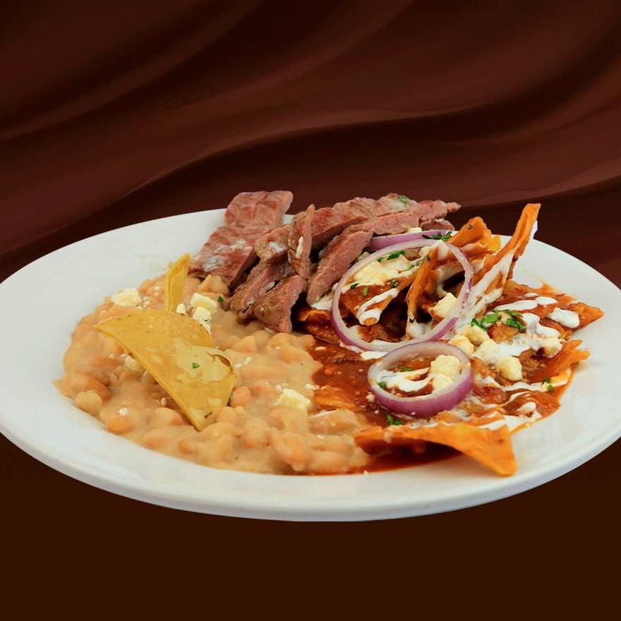 Totopos de la casa bañados en salsa de tu preferencia, acompañados con arrachera 130 gr, cebolla, frijoles refritos, queso fresco y crema.