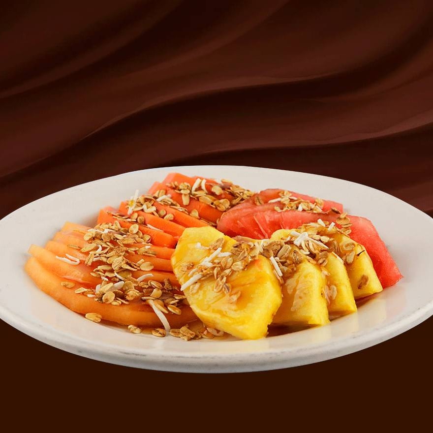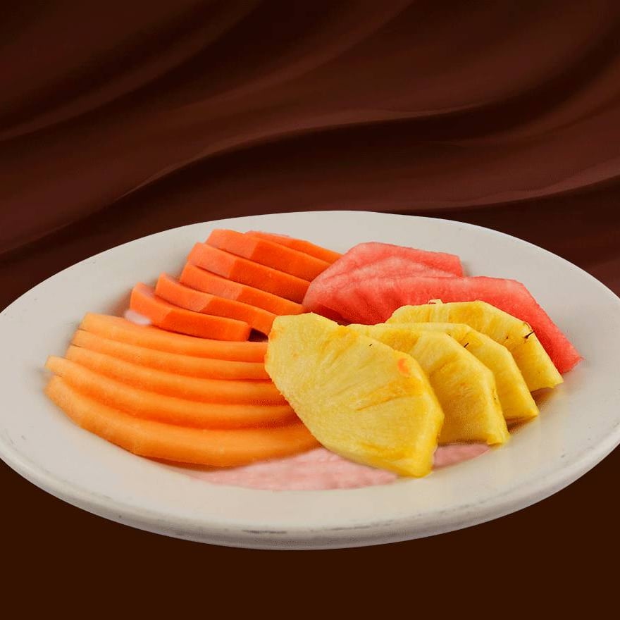 (4 frutos a escoger). Papaya, sandia, melón, plátano, piña, fresa, kiwi y manzana. Acompañado con granola, avena y yogur