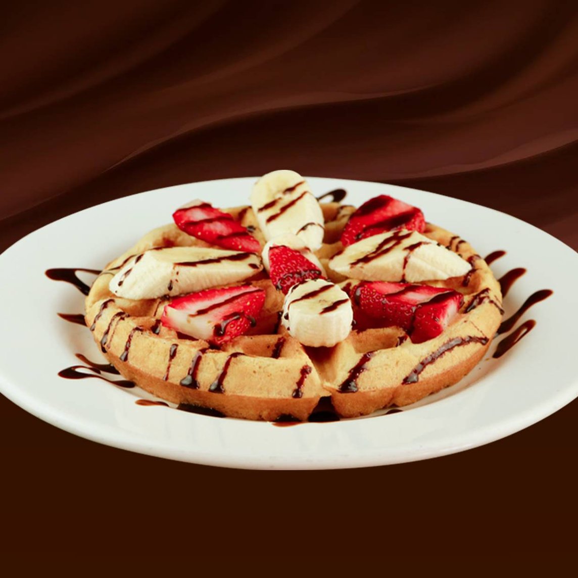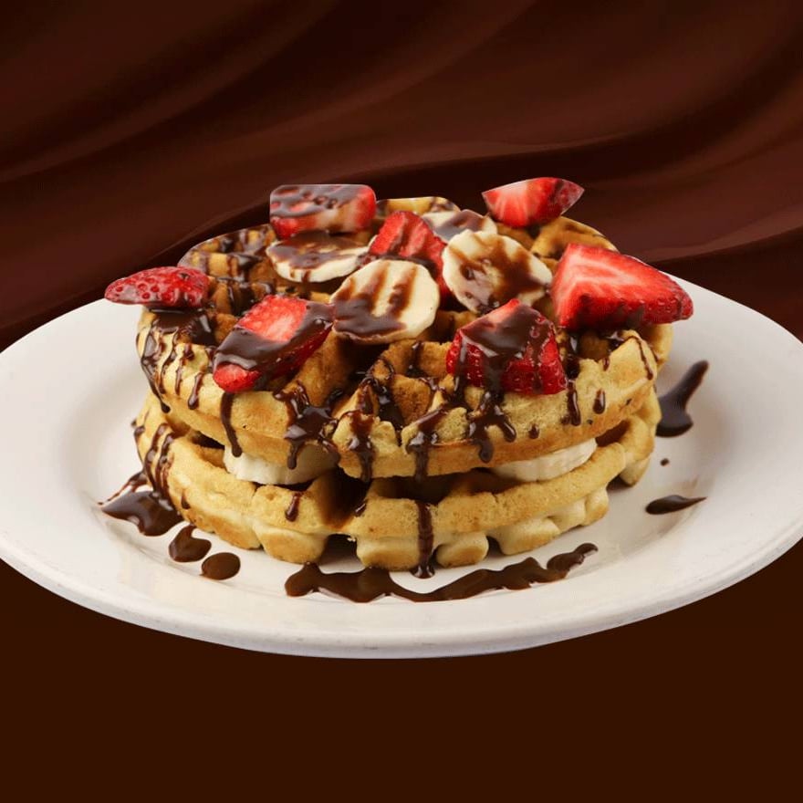 Un waffle preparado con nuestra deliciosa pasta de la casa, acompañado con plátano y fresa bañado con chocolate o mermelada, o miel maple.