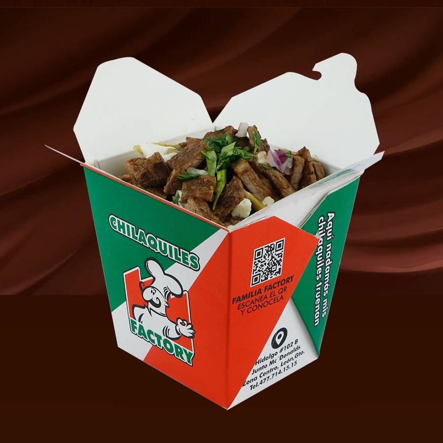 Deliciosos chilaquiles en presentación cajita con cebollita, cilantro, crema y queso fresco acompañados de la carne de tu preferencia.