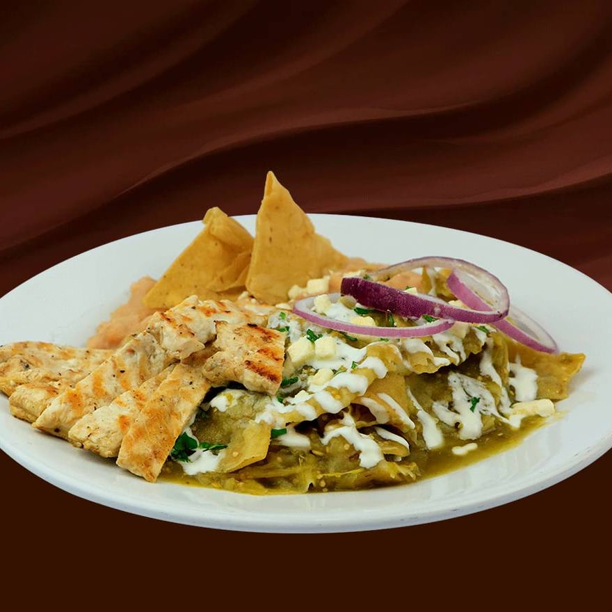 Totopos de la casa bañados en salsa de tu preferencia, acompañados con pollo 130 gr, cebolla, frijoles refritos, queso fresco y crema.