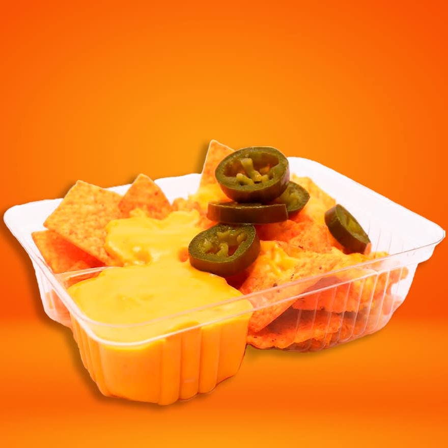 Doritos crujientes bañados con queso cheddar fundido acompañados de jalapeños en rodajas o picado.