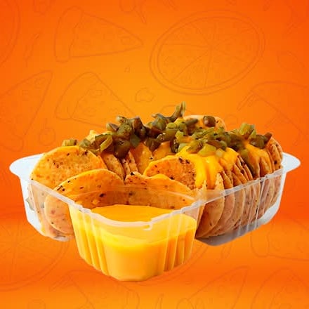 Totopos crujientes bañados con queso cheddar fundido acompañados de jalapeños en rodajas o picado.