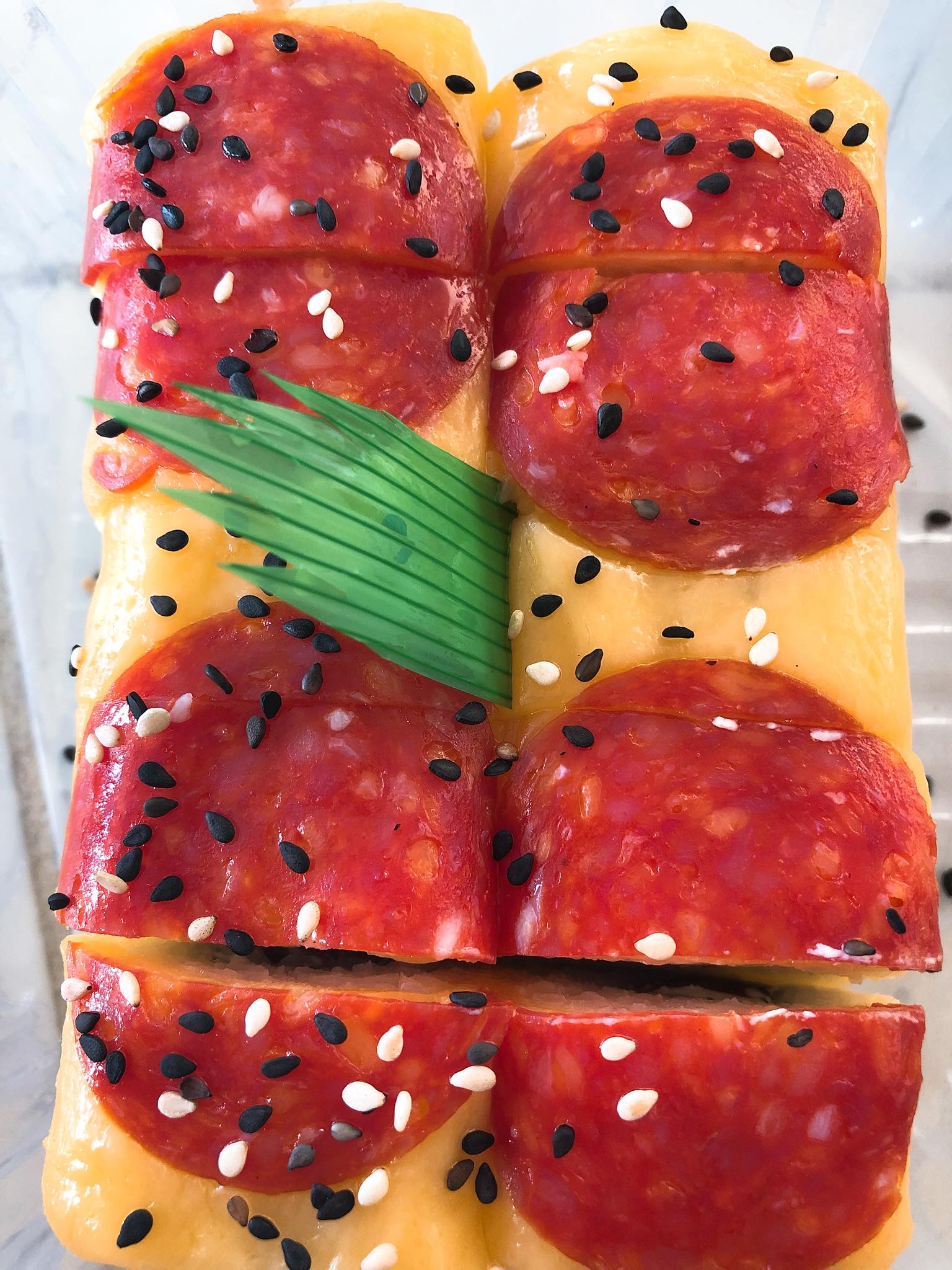 Envuelto en queso gouda, relleno de mortadela, salami y tocino. Bañado en salsa chipotle y teriyaki.