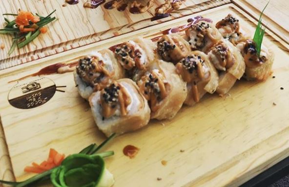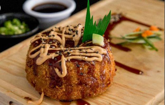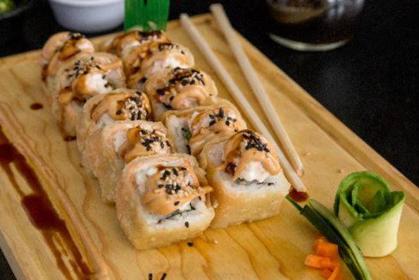 Envuelto en plátano macho frito y ajonjolí, relleno de salmón, queso crema y aguacate, bañado con salsa de anguila.