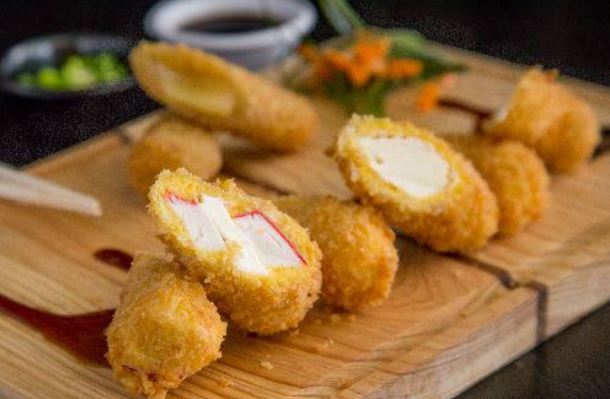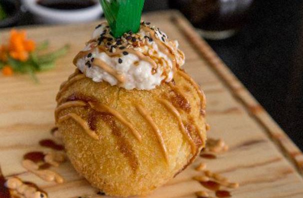 Envuelto en kakiague (verduras capeadas), por dentro aguacate, queso crema y cangrejo, bañado en salsa de anguila.