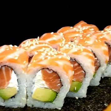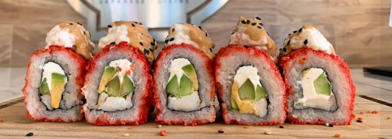 Envuelto en aguacate, salmón, atún y masago, por dentro cangrejo, queso crema y pepino.