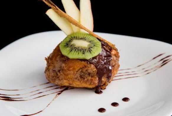 Crujiente tempura frito, relleno de nieve y bañado con chocolate.