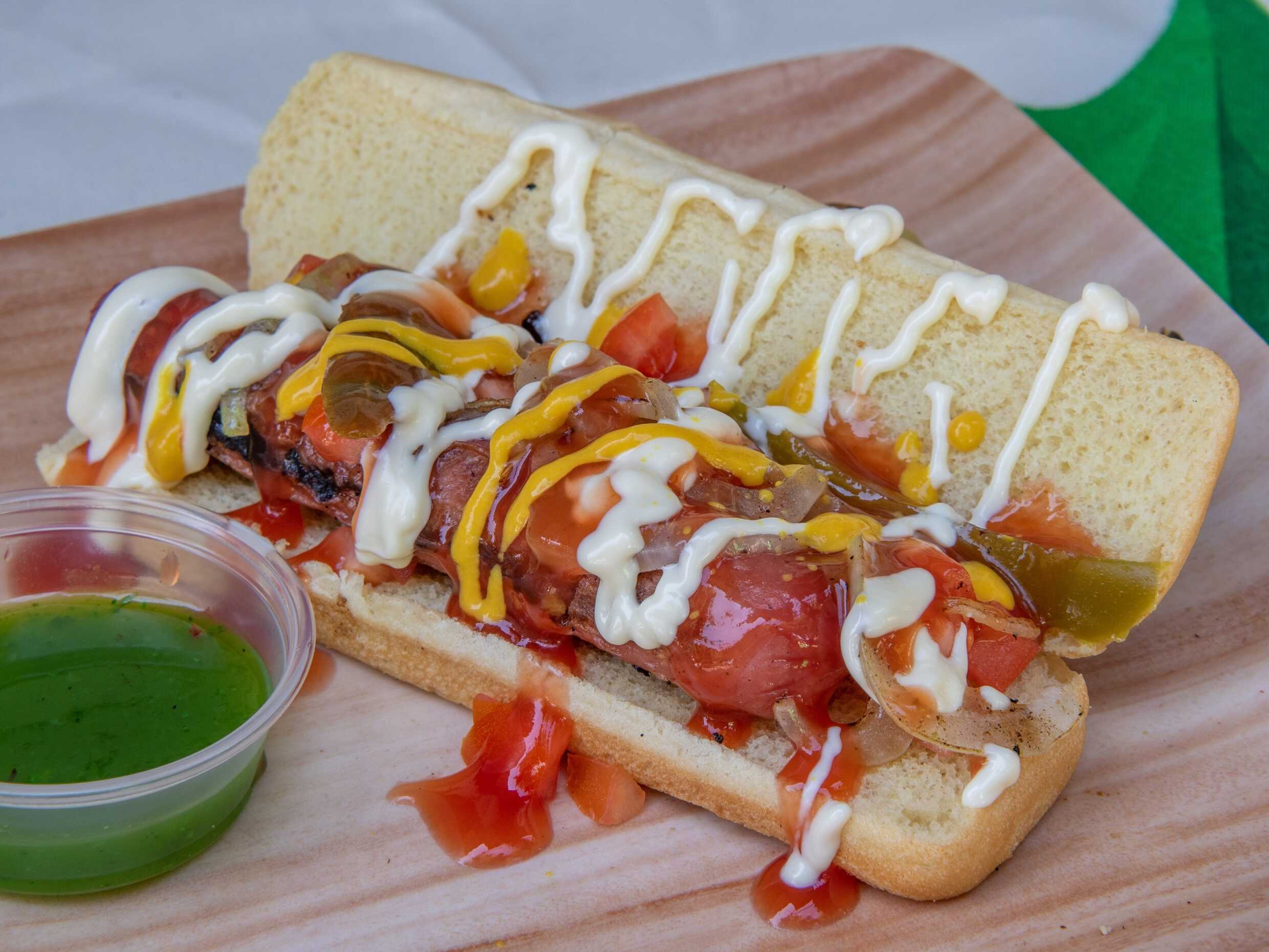 Salchicha de pavo, jitomate, cebolla asada, jalapeño, cátsup, mayonesa y mostaza.