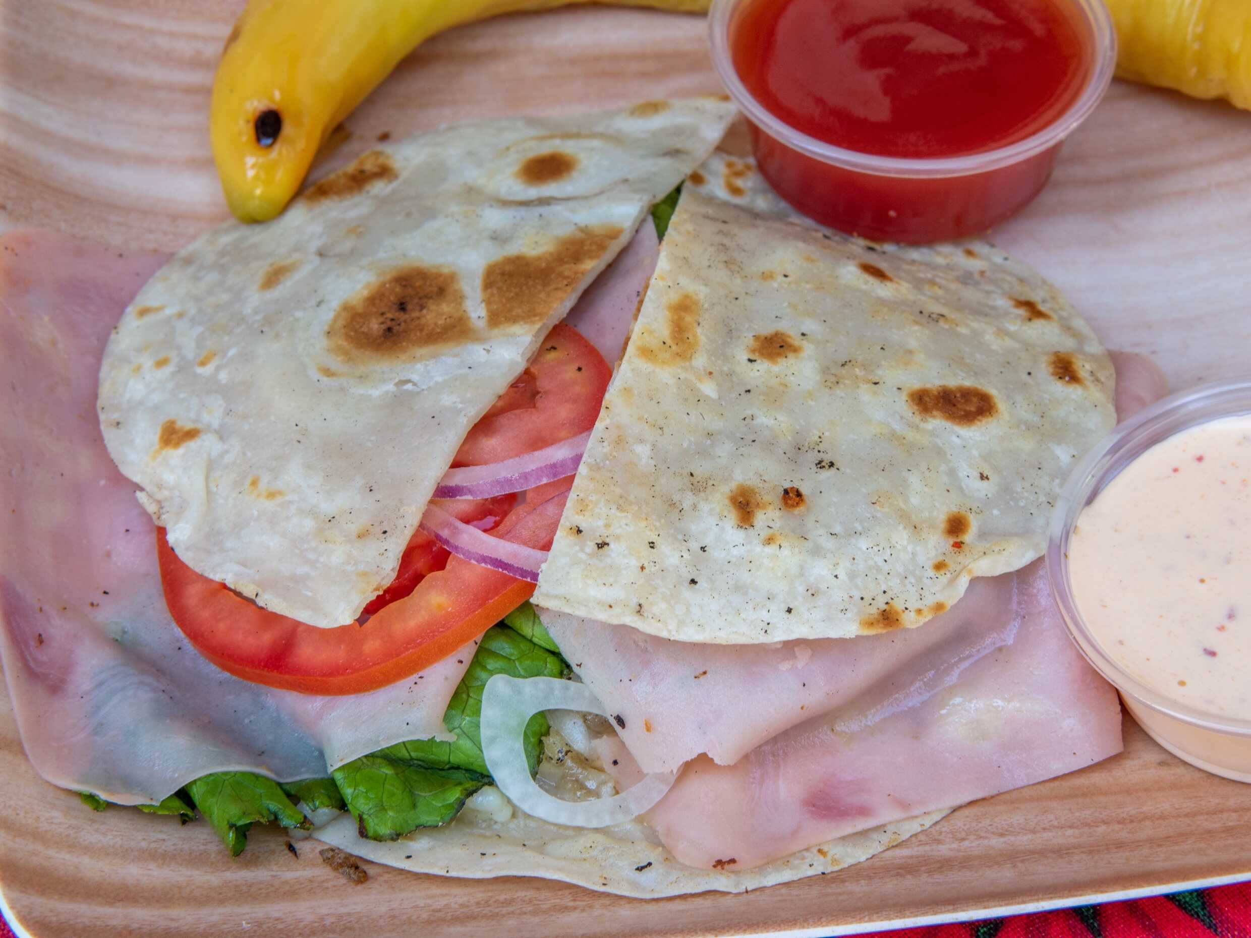 Tortillas de harina empalmadas rellenas de queso asadero/amarillo, jamón, lechuga jitomate, cebolla, jalapeño y aderezos.