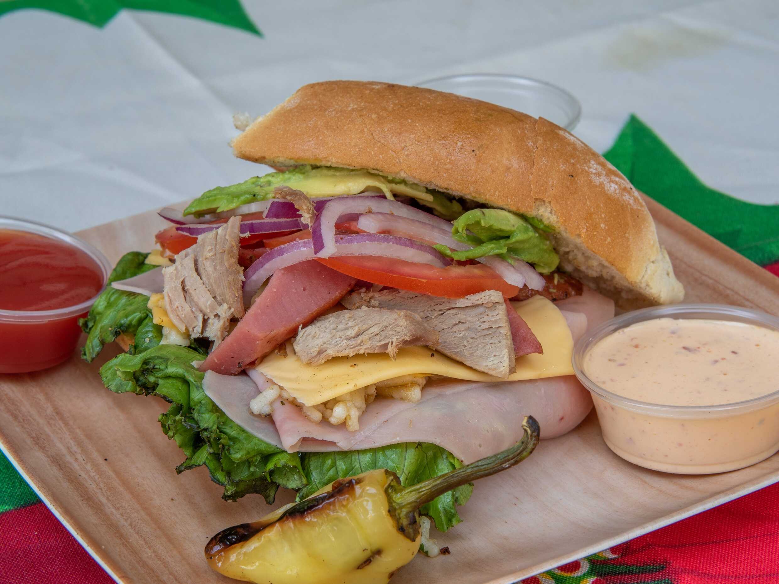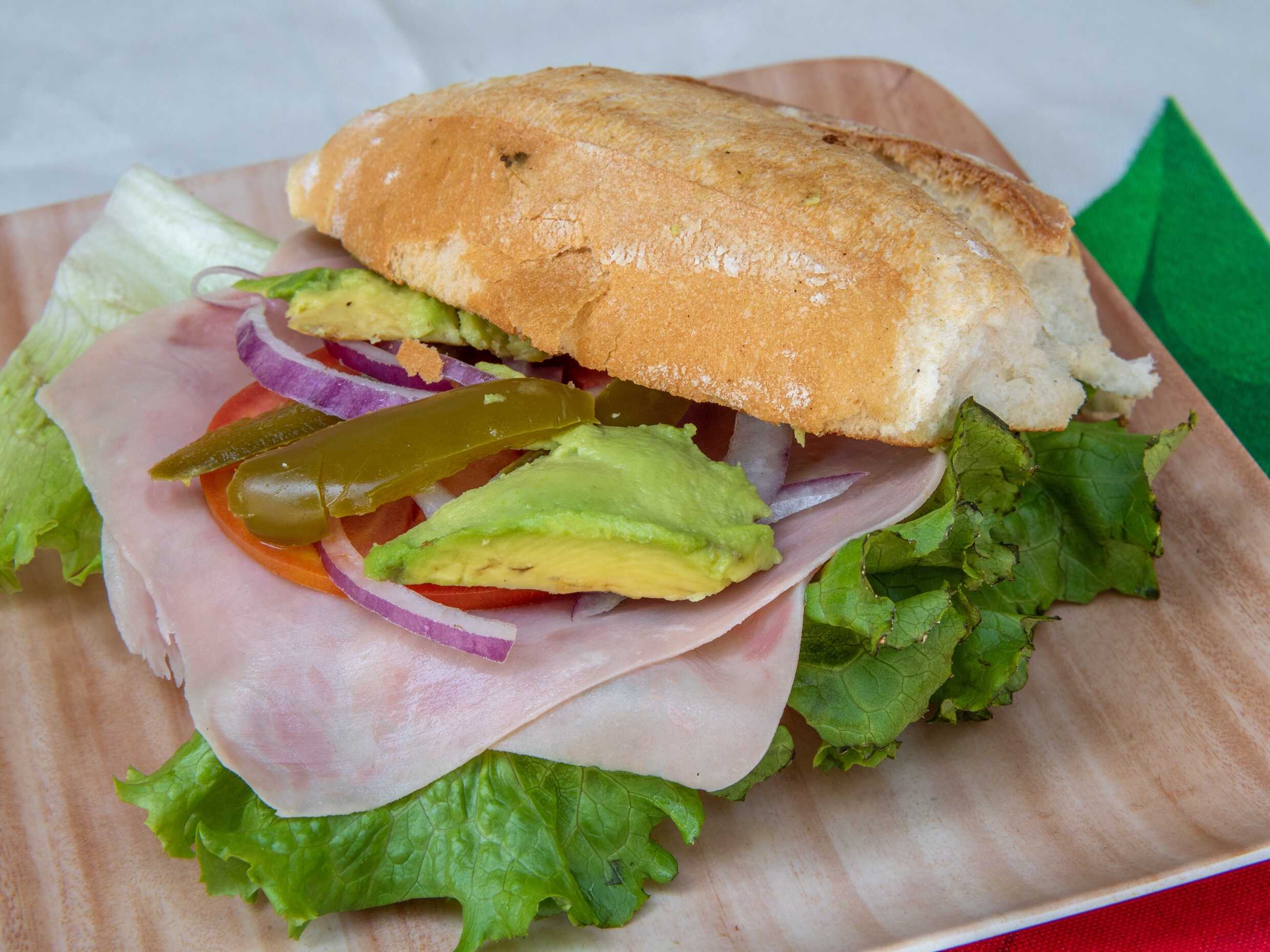 Sándwich de ingrediente a elección con lechuga, jitomate, cebolla, jalapeño, cátsup, mayonesa y mostaza.