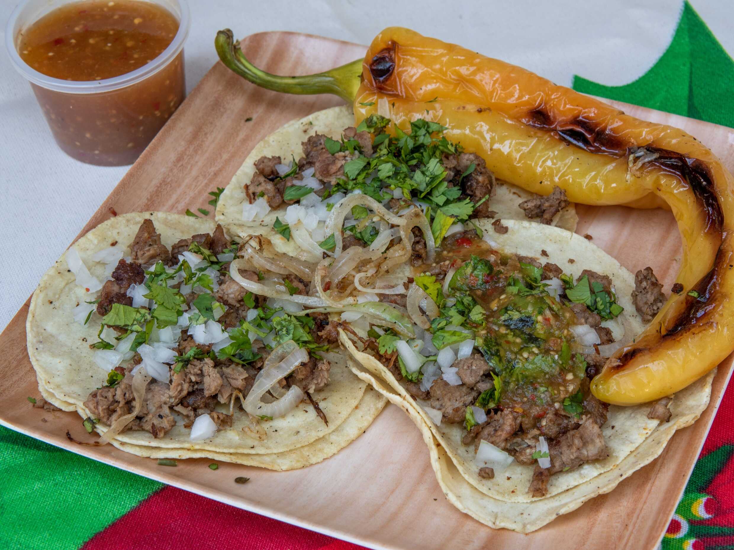 Doble tortilla con bistec de res, cilantro cebolla, salsa casera y complementos a elección.