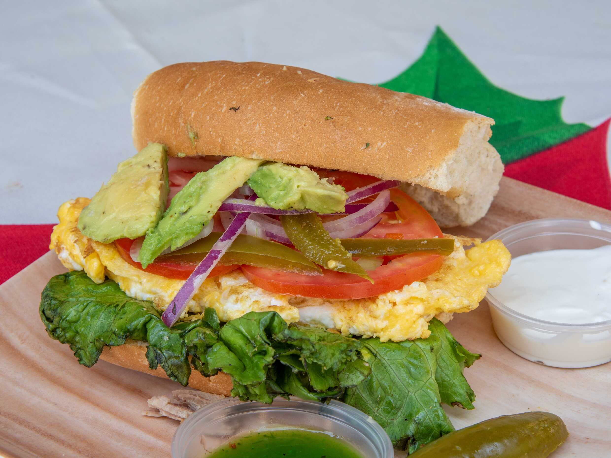Huevo con lechuga, jitomate, cebolla, jalapeño y mayonesa.