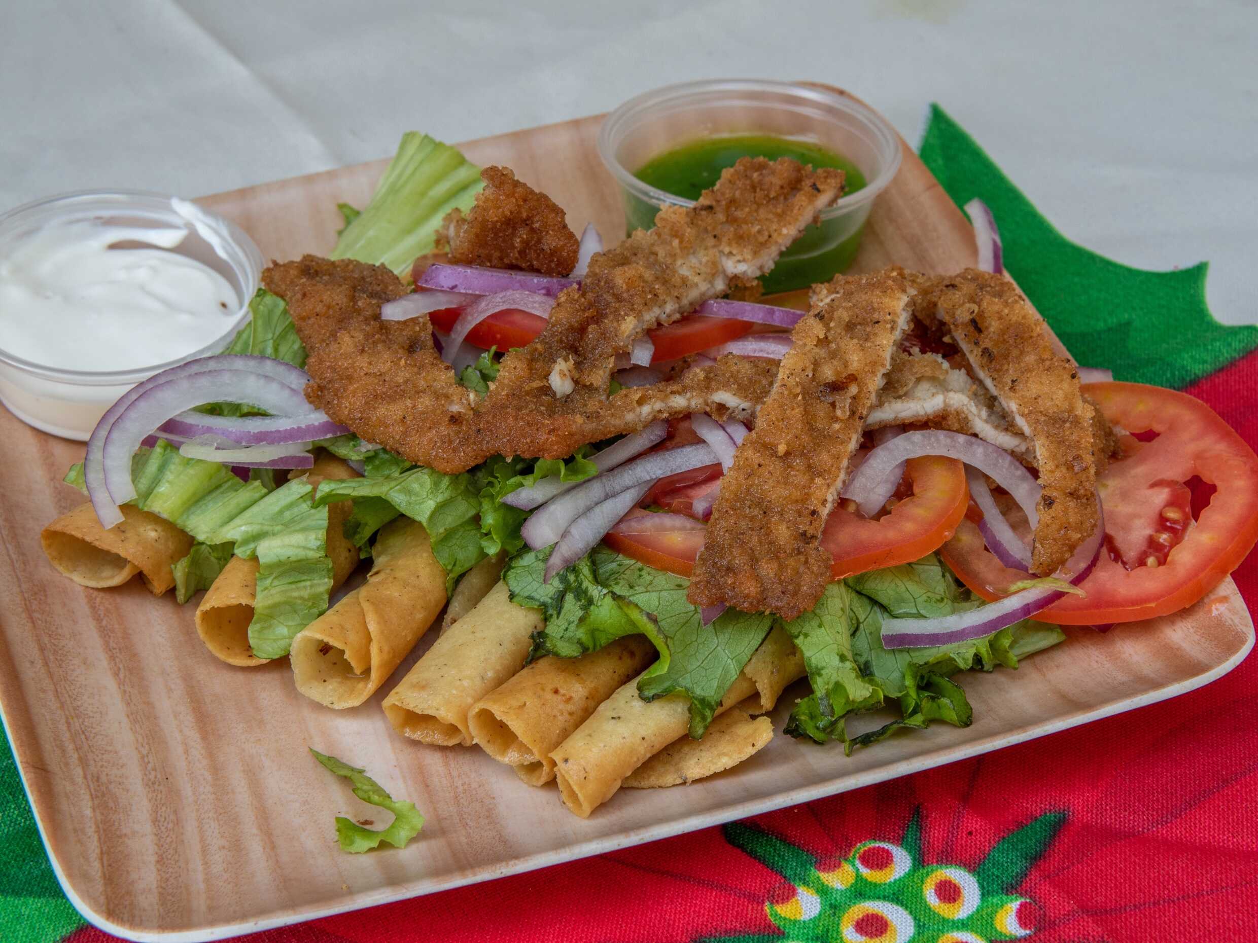 6 Tacos dorados rellenos de queso con lechuga, jitomate, cebolla, crema, salsa a elección y milanesa.
