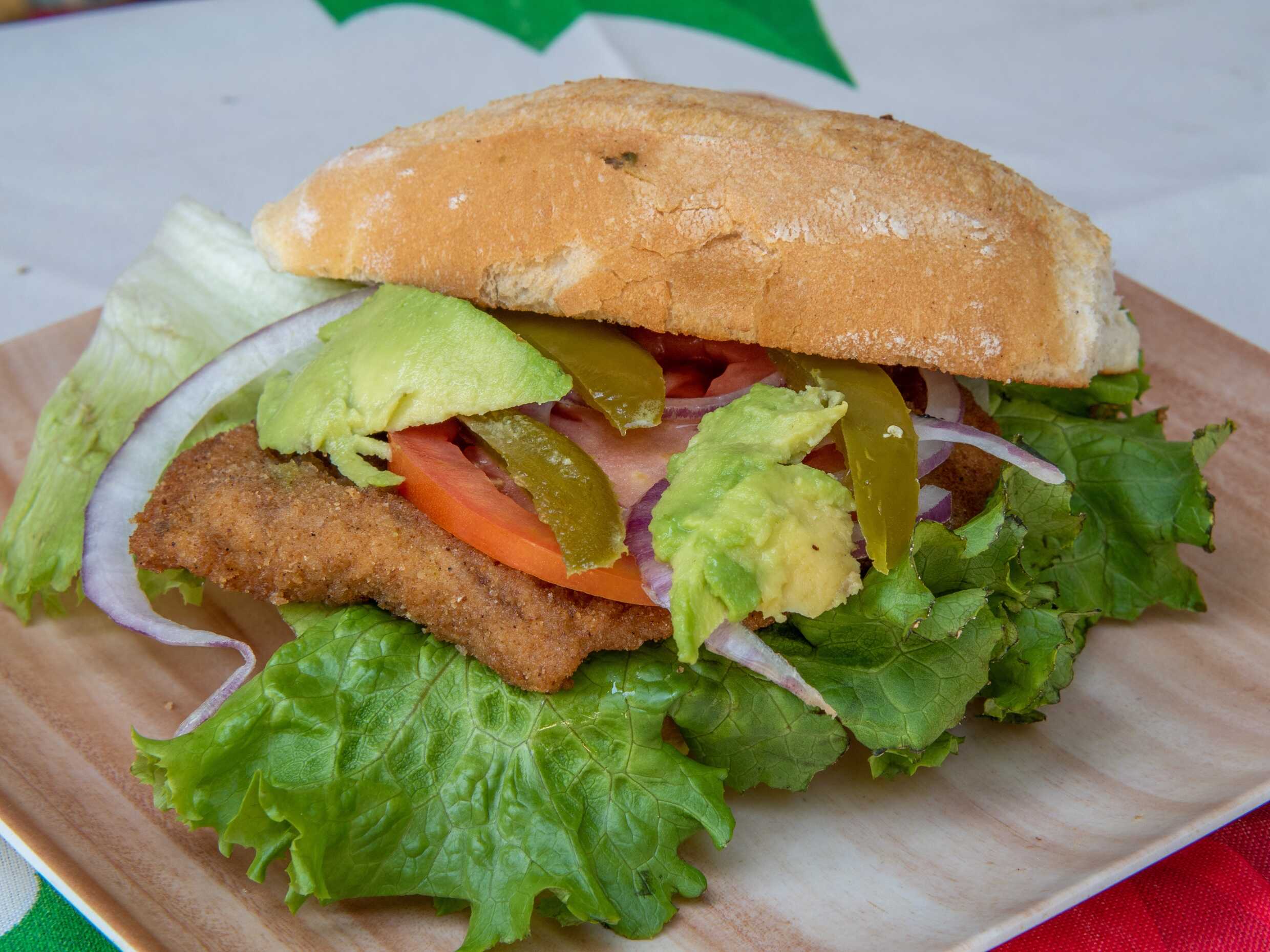 Sándwich de milanesa a elección, jitomate, cebolla, aguacate, jalapeño, mayonesa.