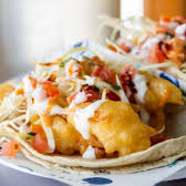 Tortilla de maiz, camaron capeado, verdura, salsa