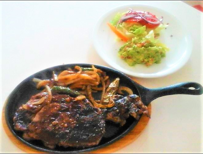 350 gramos de carne acompañada de papas a la francesa , ensalada y guacamole