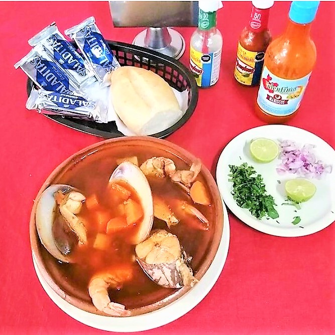 Con bolsa de totopos, salsa, cátsup y tostadas.