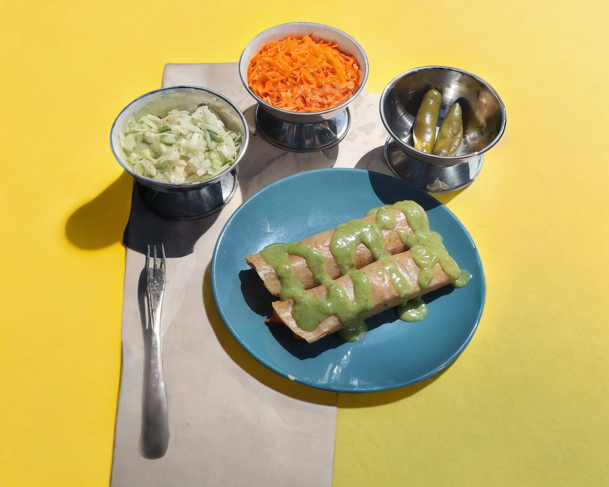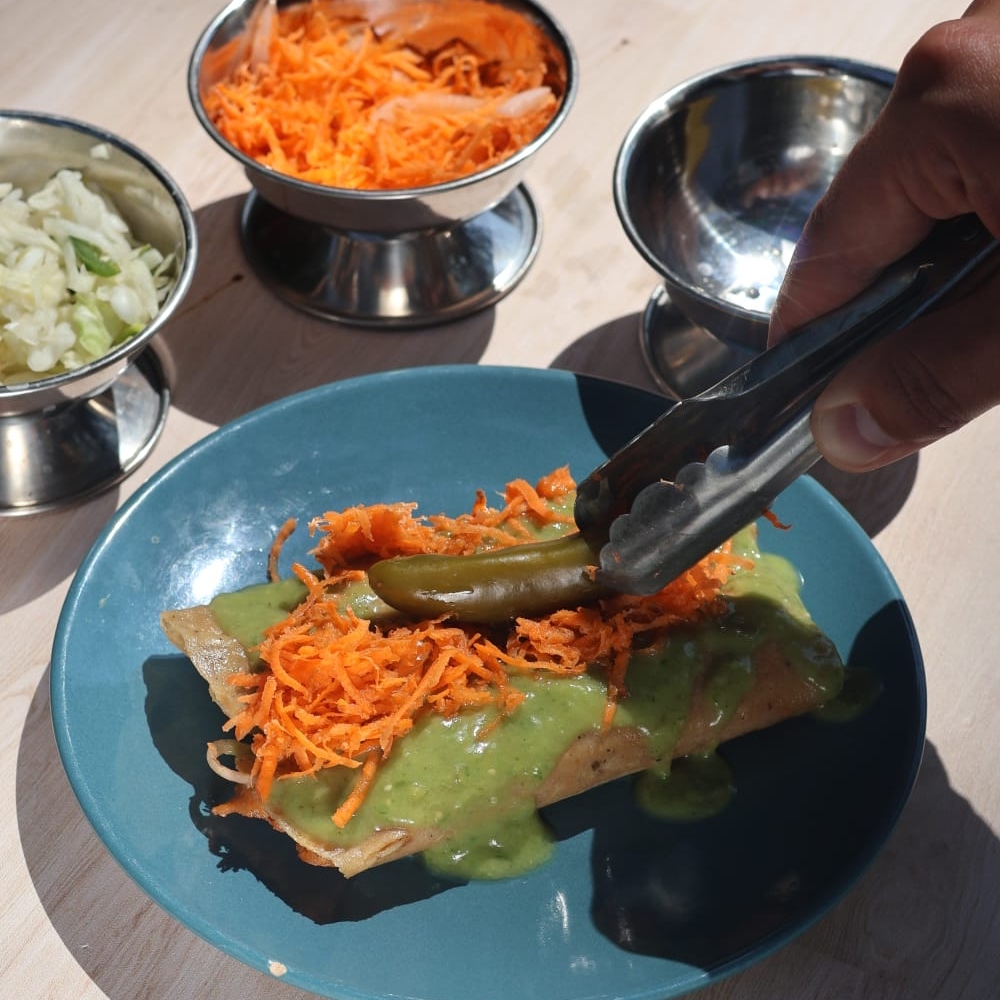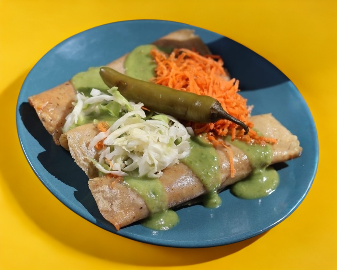 Tortilla de maíz con chicharrón prensado en salsa de chile guajillo.