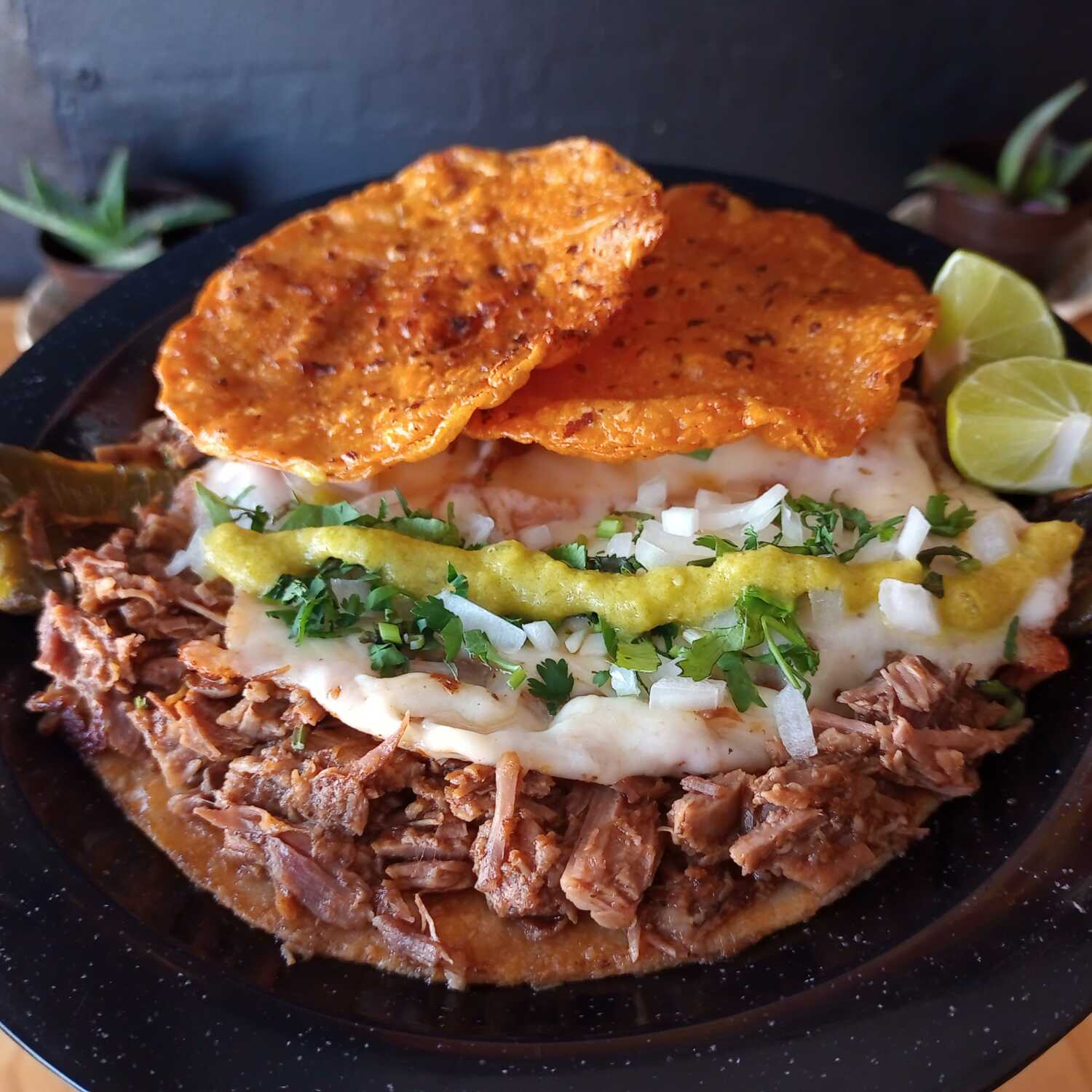 Tortilla de comal ligeramente dorada con birria y queso