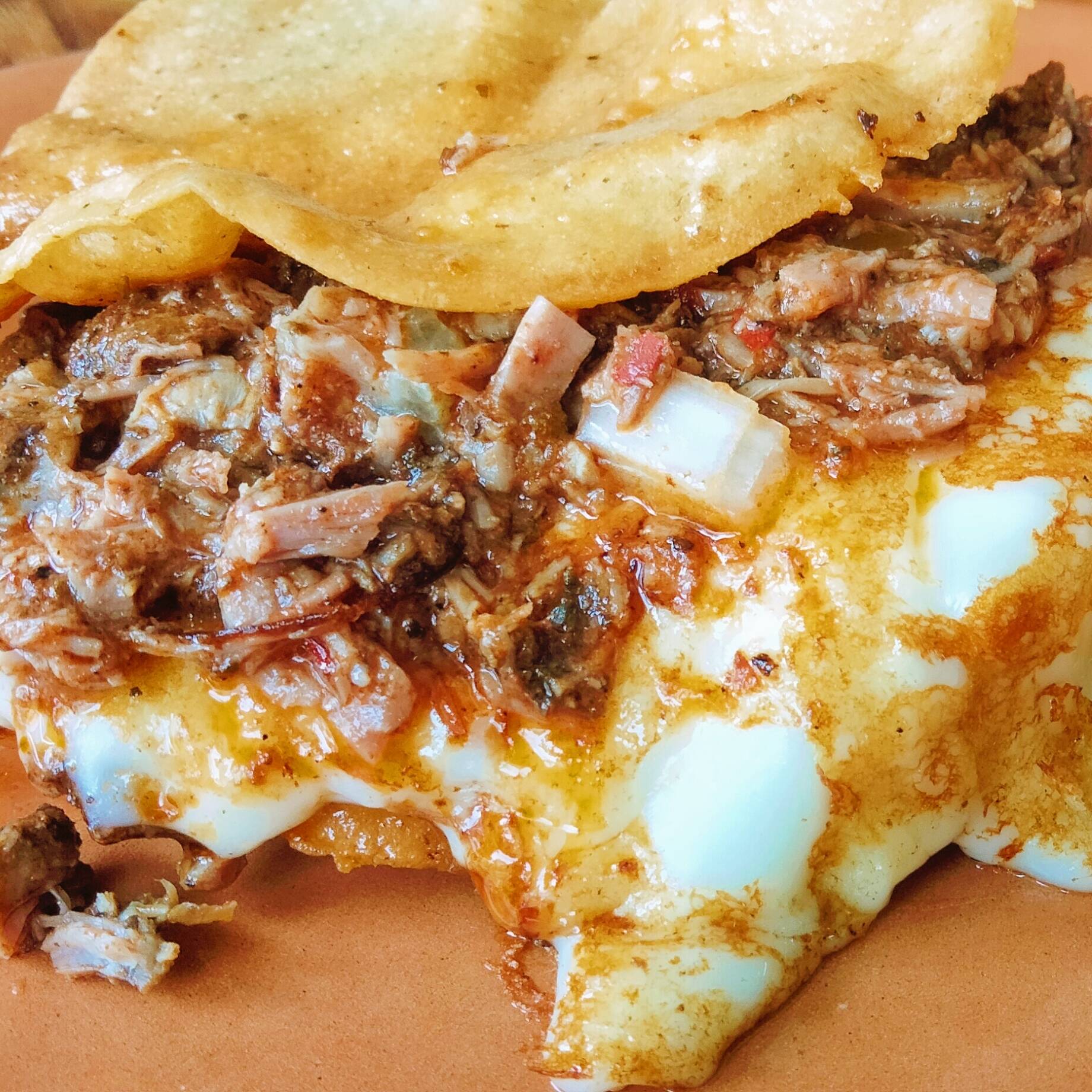 Tortilla de maíz dorada con queso y birria