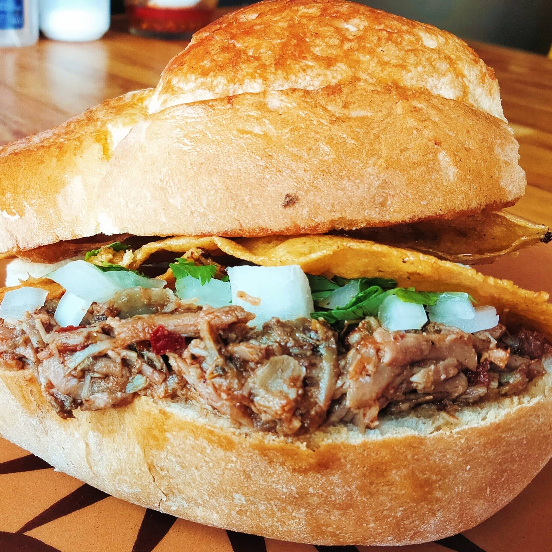 Bolillo relleno de chile asado, birria y queso