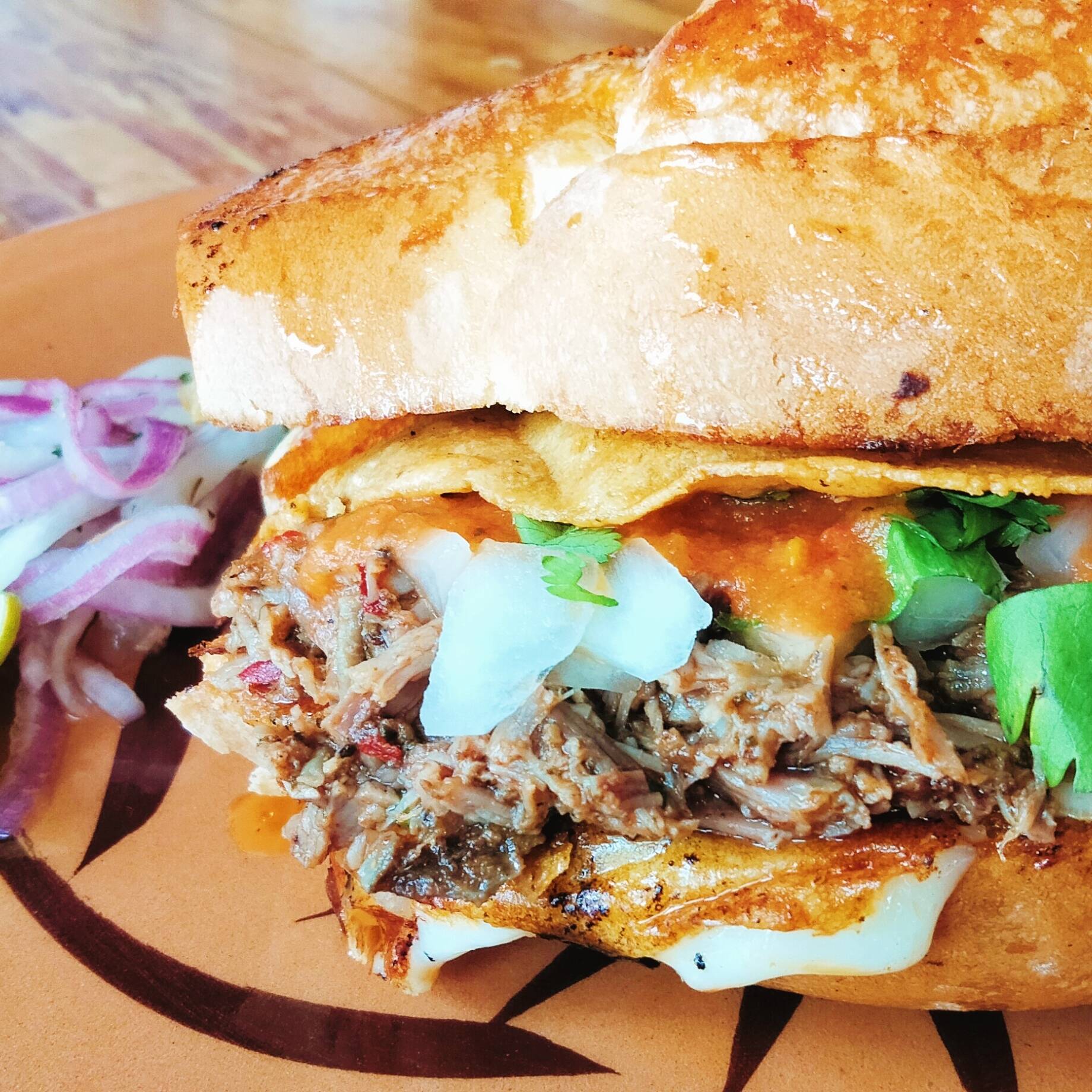 Bolillo con queso fundido y birria