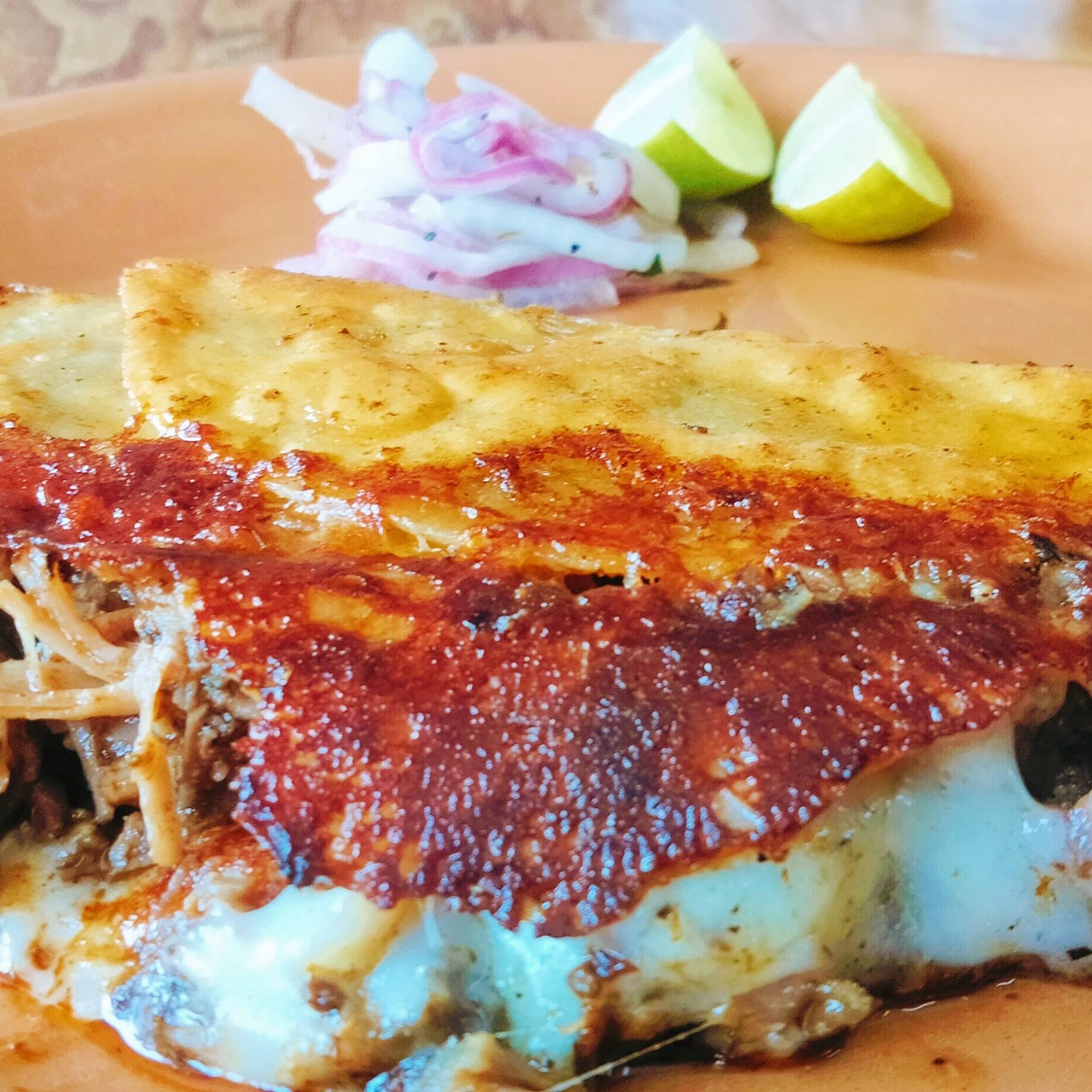Tortilla de maíz ligeramente dorada con queso y birria