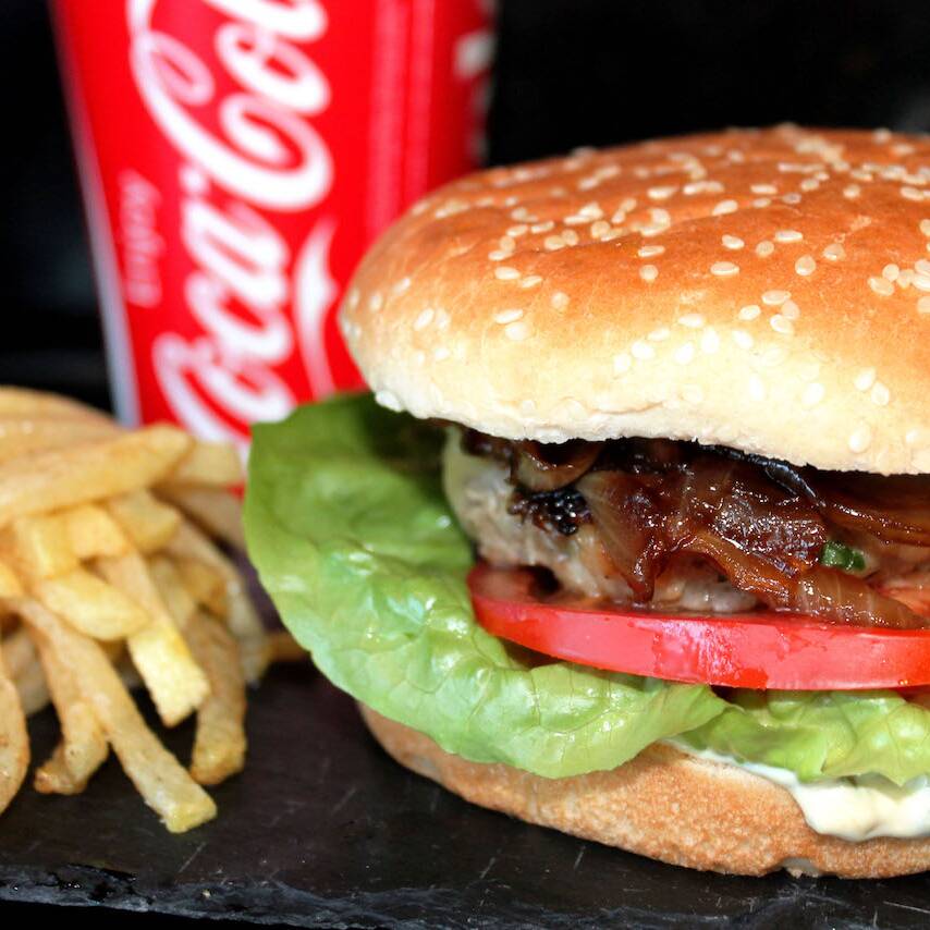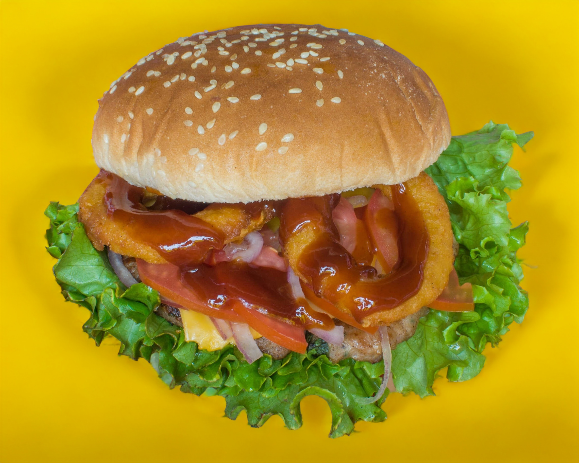 Deliciosa hamburguesa con queso amarillo,3 aros de cebolla, salsa BBQ (jitomate, cebolla y lechuga).