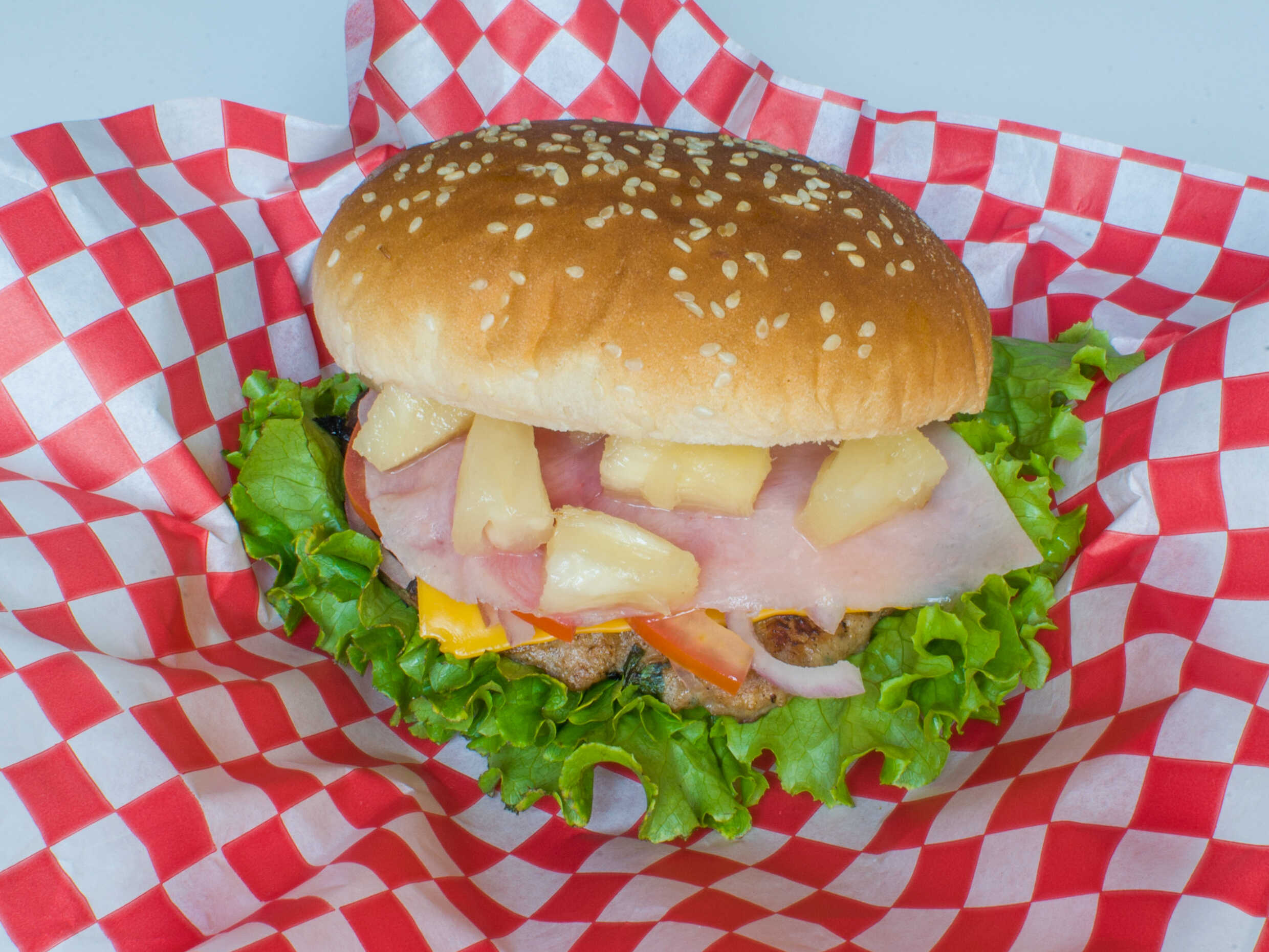 Deliciosa hamburguesa con jamón, piña, queso amarillo (jitomate, cebolla y lechuga), incluye cátsup, chimichurri y mostaza aparte.