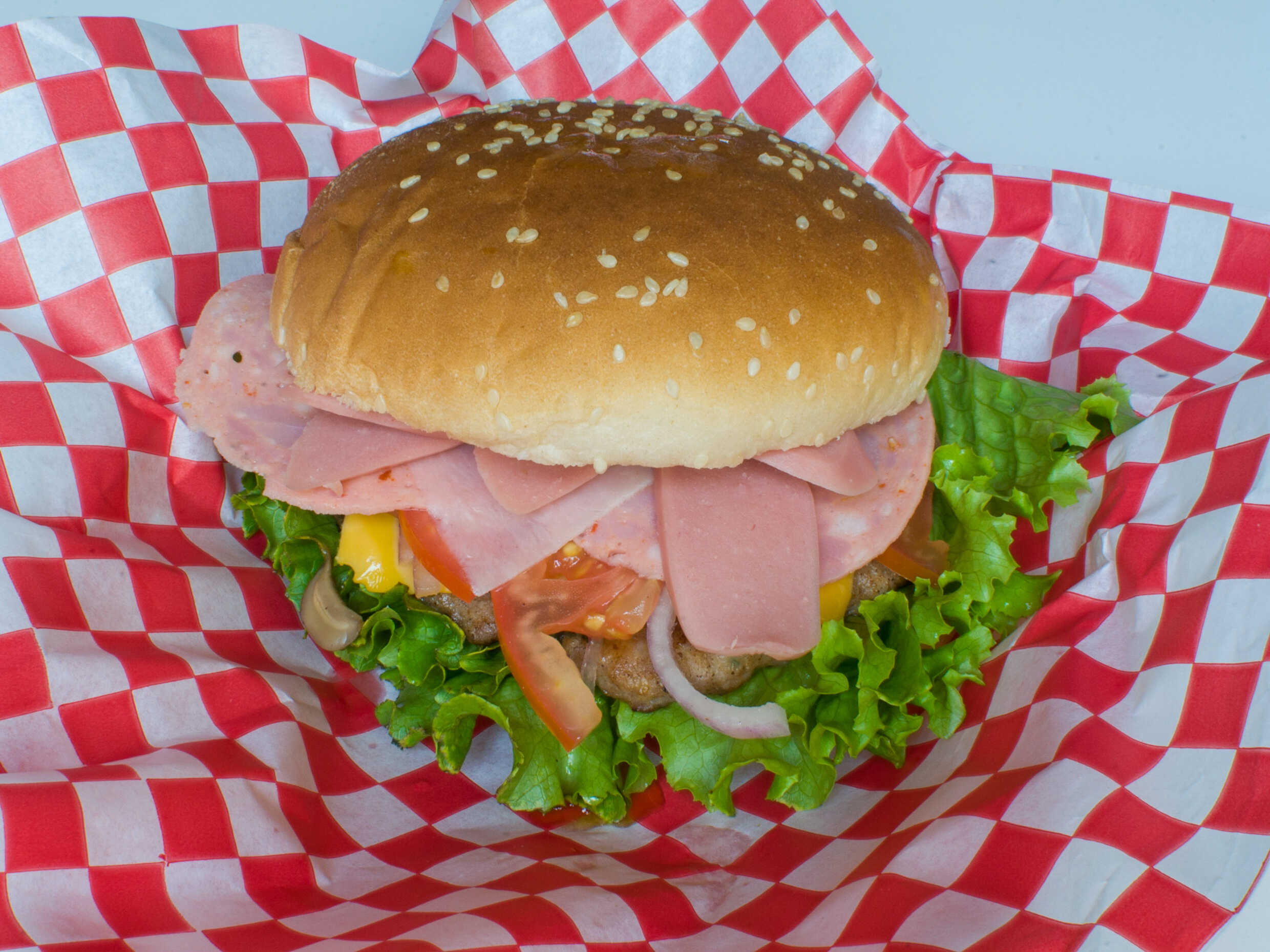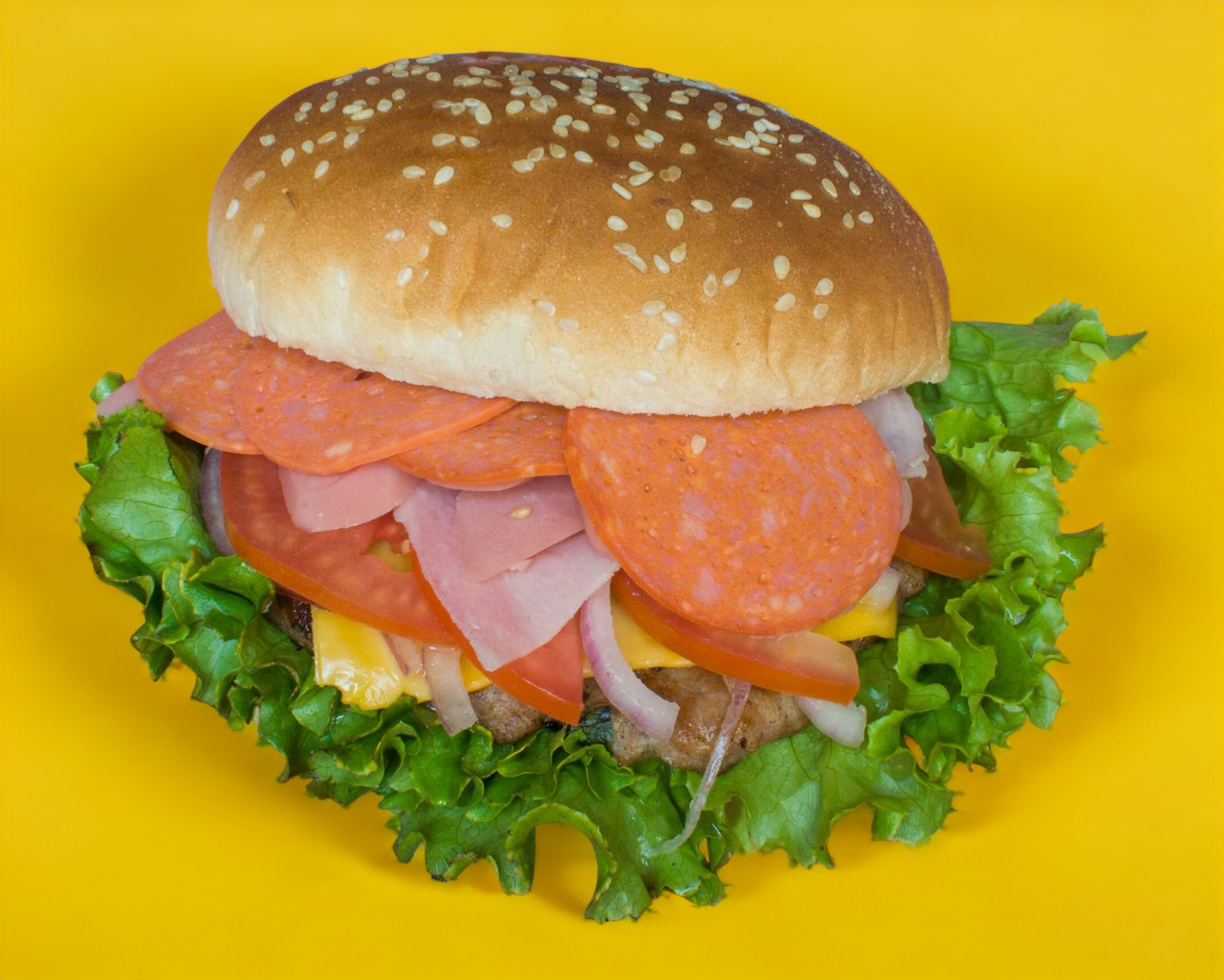 Deliciosa hamburguesa con jamón, pepperoni, salchicha y tocino jitomate, cebolla, lechuga,(cátsup, mostaza y chimichurri aparte)