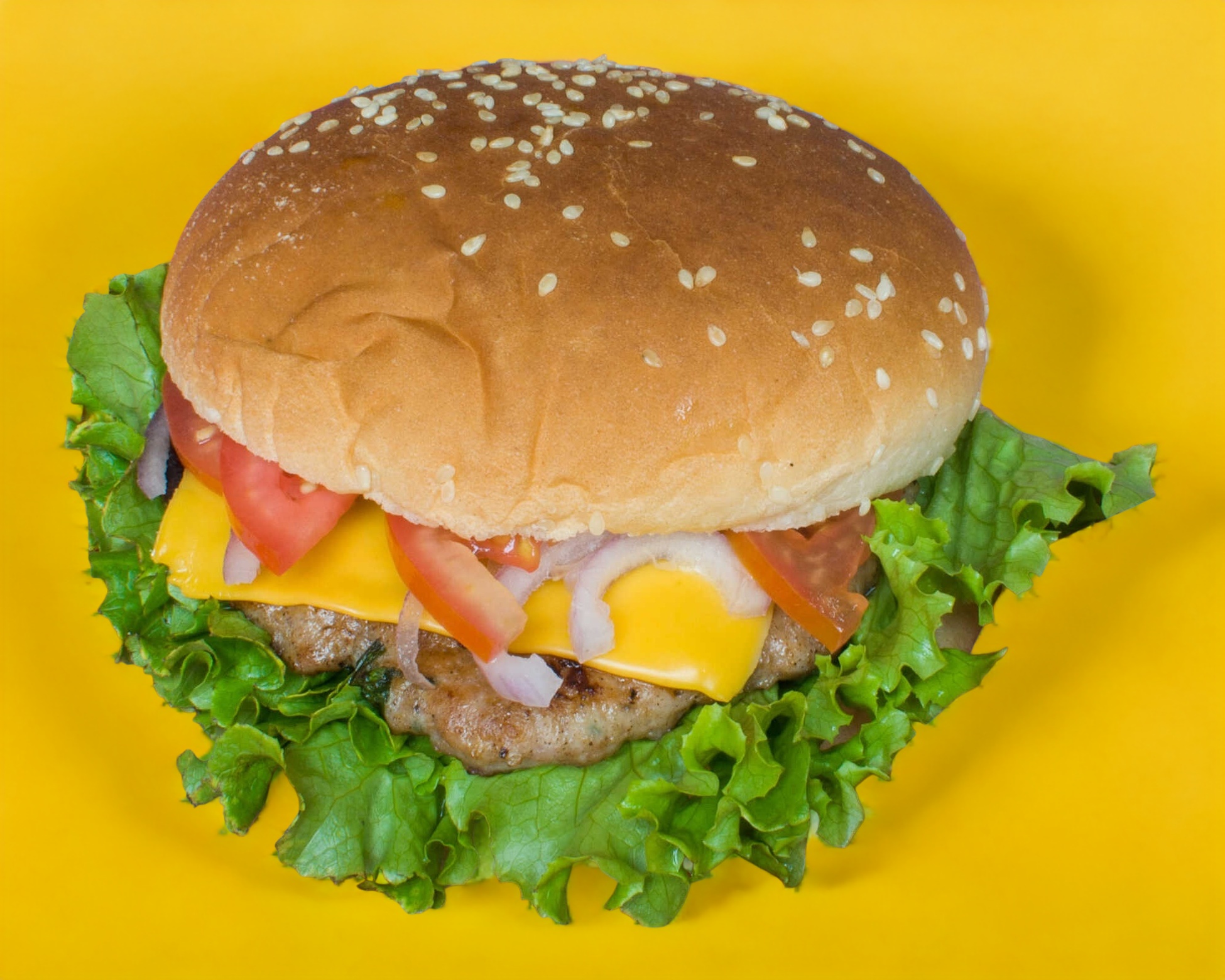 Deliciosa hamburguesa con queso amarillo, jitomate, cebolla y lechuga (cátsup, mostaza y chimichurri aparte).