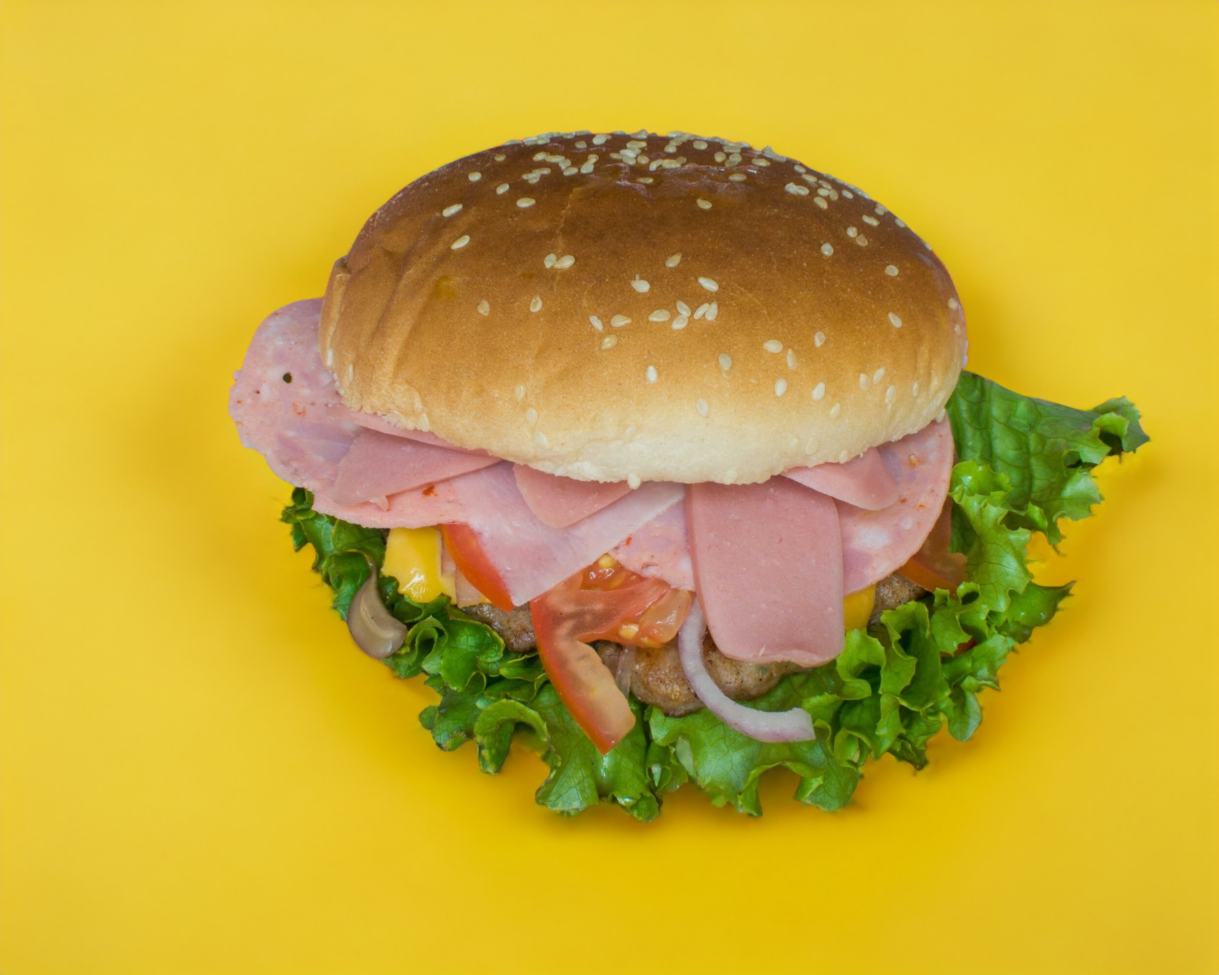 Deliciosa hamburguesa con queso amarillo, jamón, salchicha, salami (jitomate, cebolla y lechuga), incluye cátsup, chimichurri y mostaza aparte.