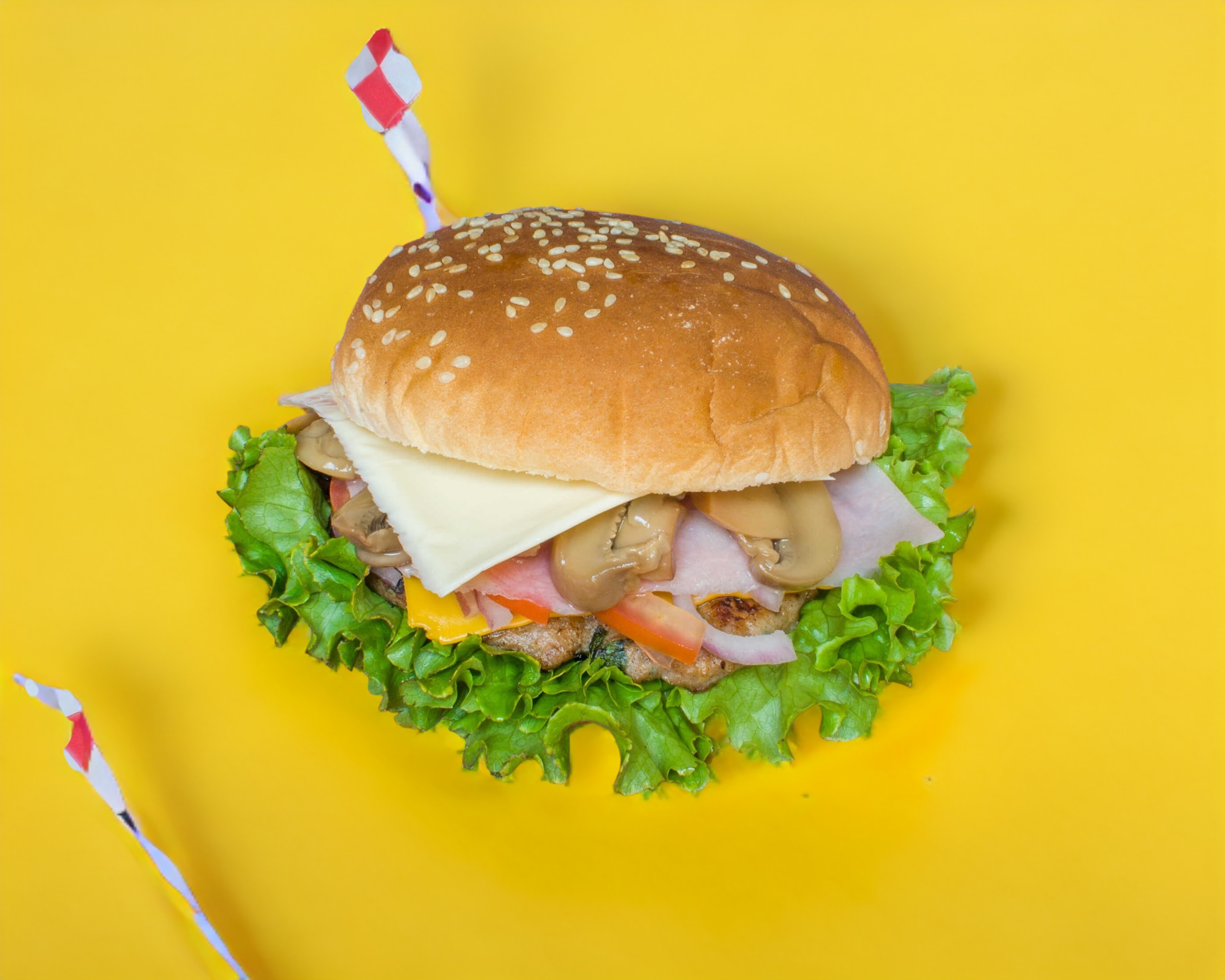 Deliciosa hamburguesa con jamón, champiñones, queso blanco, queso amarillo (jitomate, cebolla y lechuga), incluye cátsup, chimichurri y mostaza aparte.