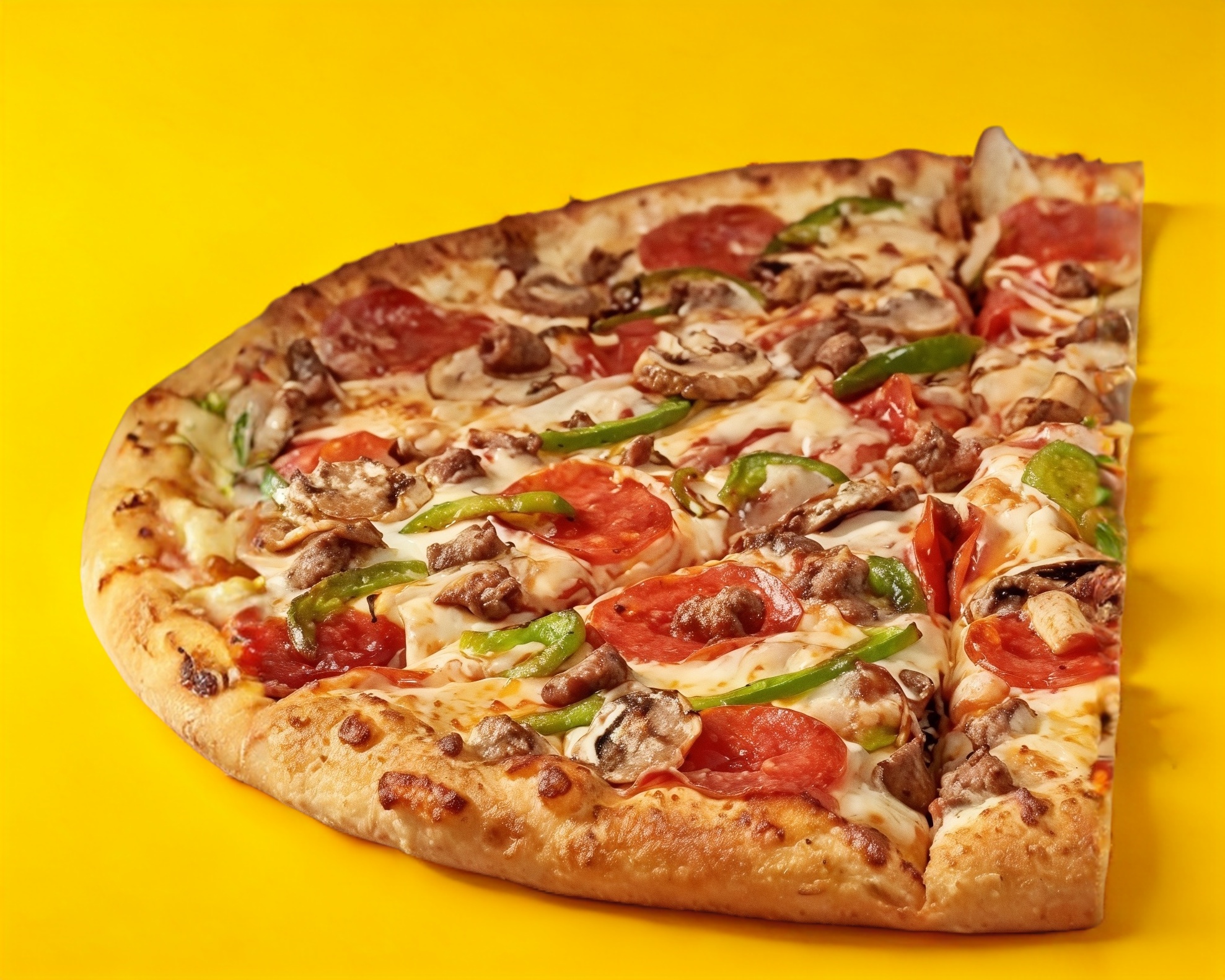Deliciosa pizza con pepperoni, cebolla,pimiento verde, champiñón y piña.