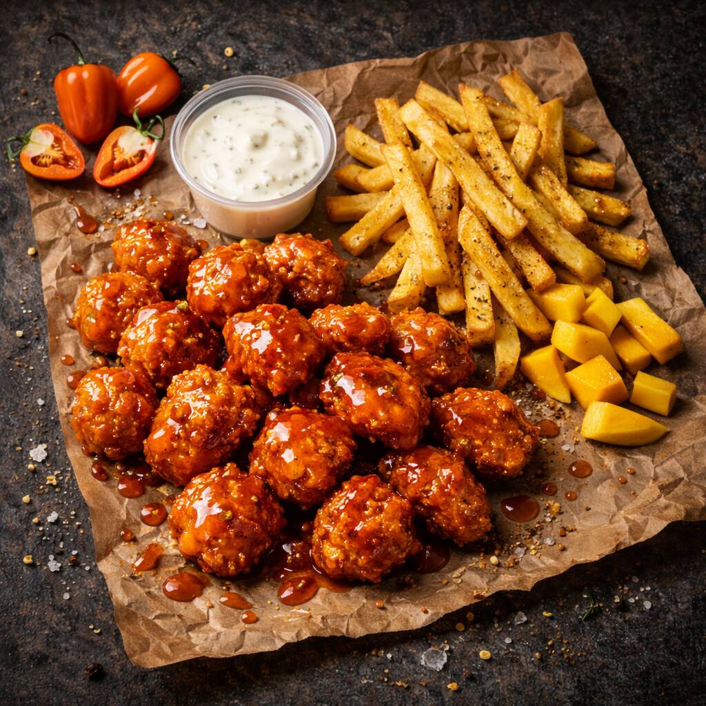285gr de chiken tenders bañados en tu salsa favorita con 125gr de papas fritas