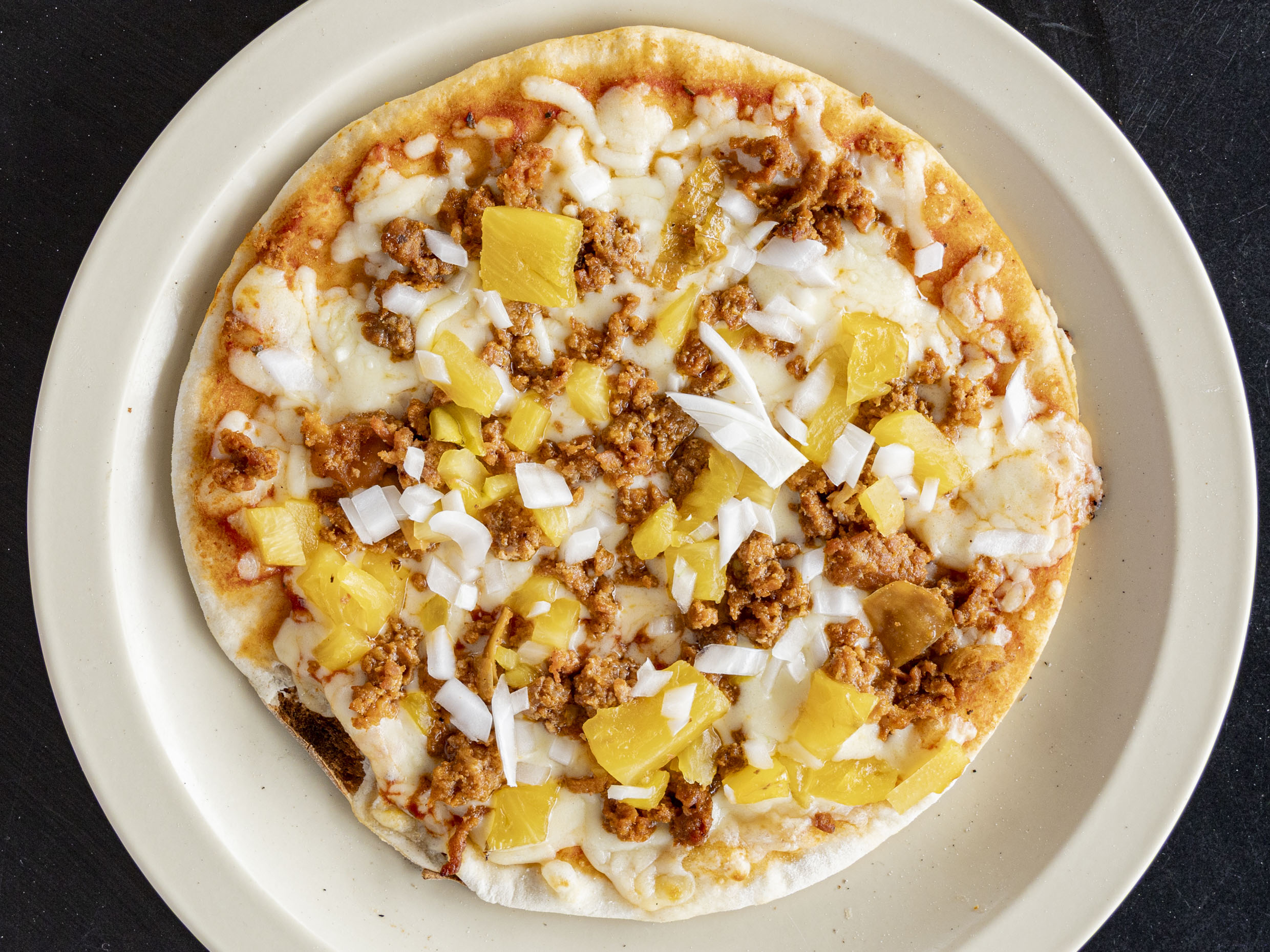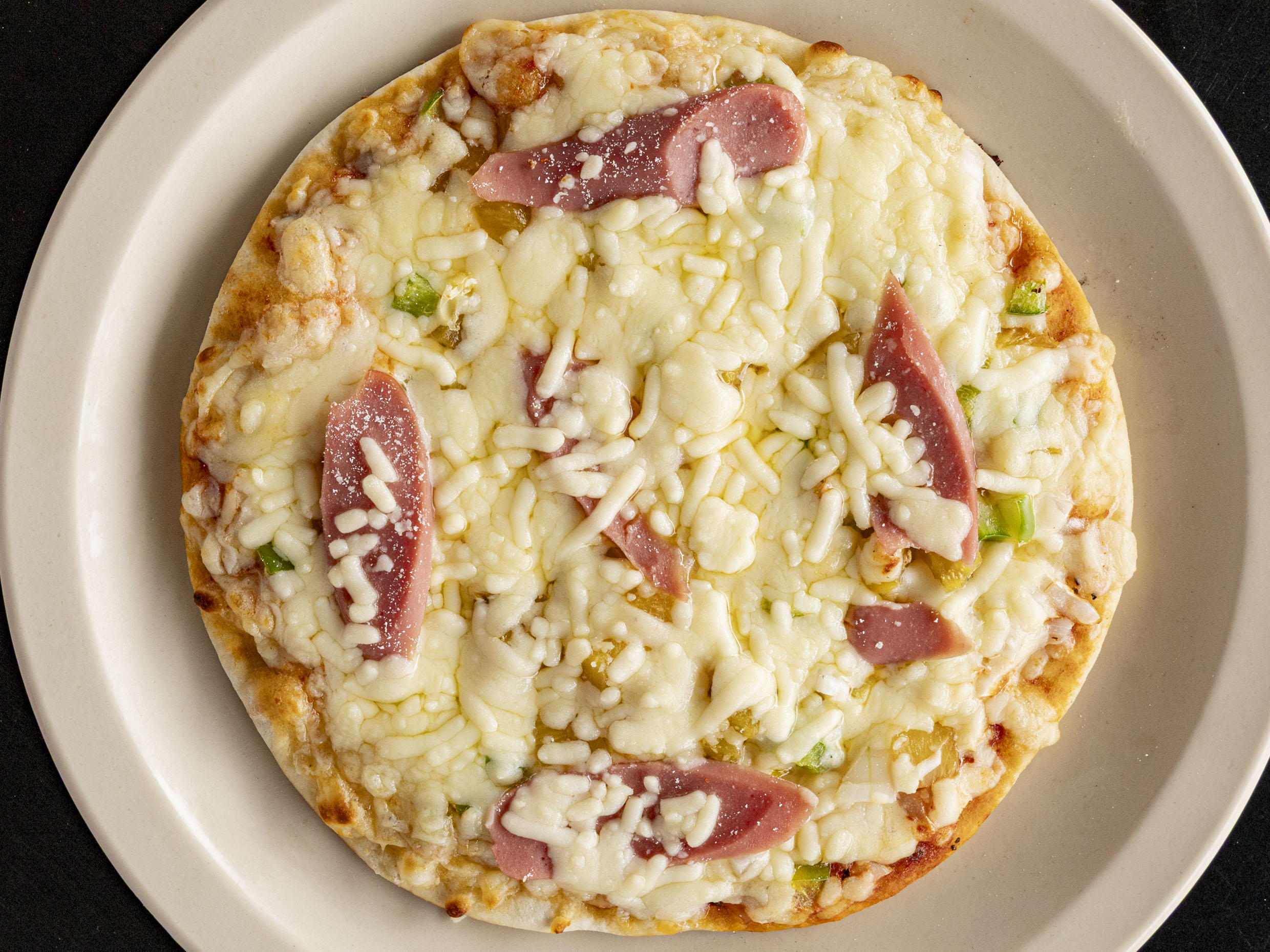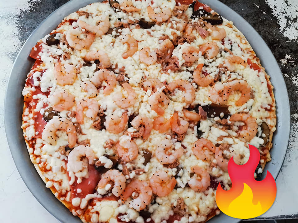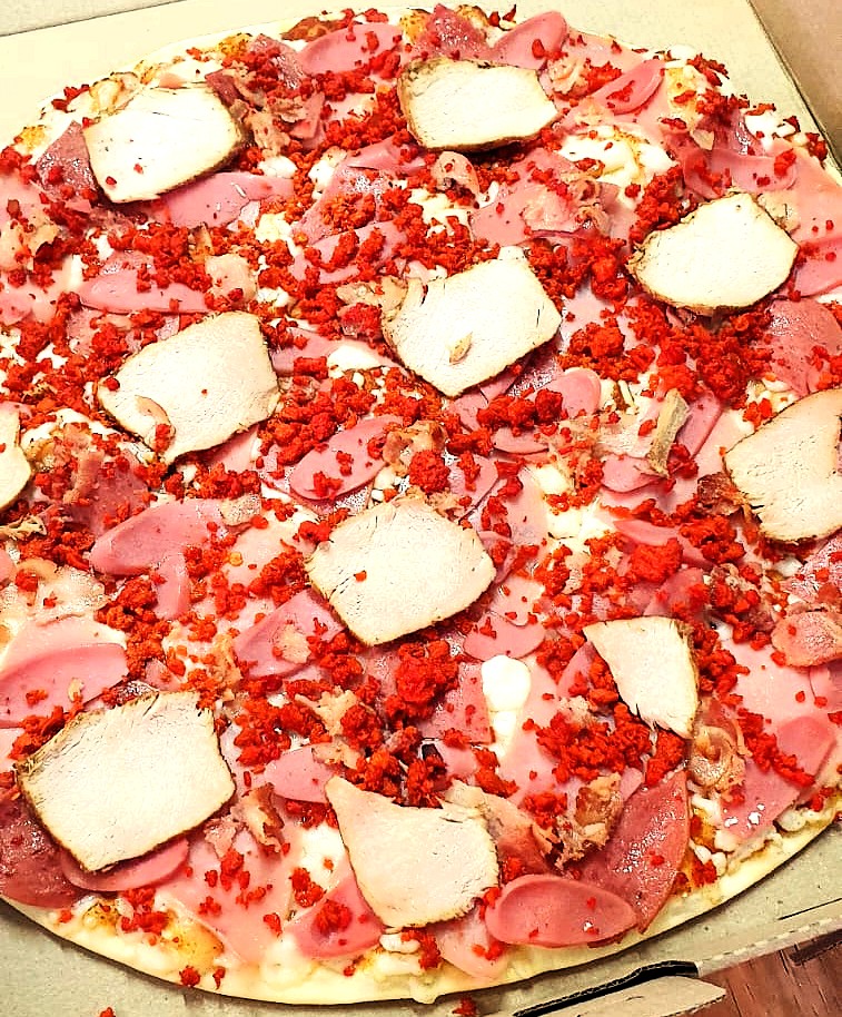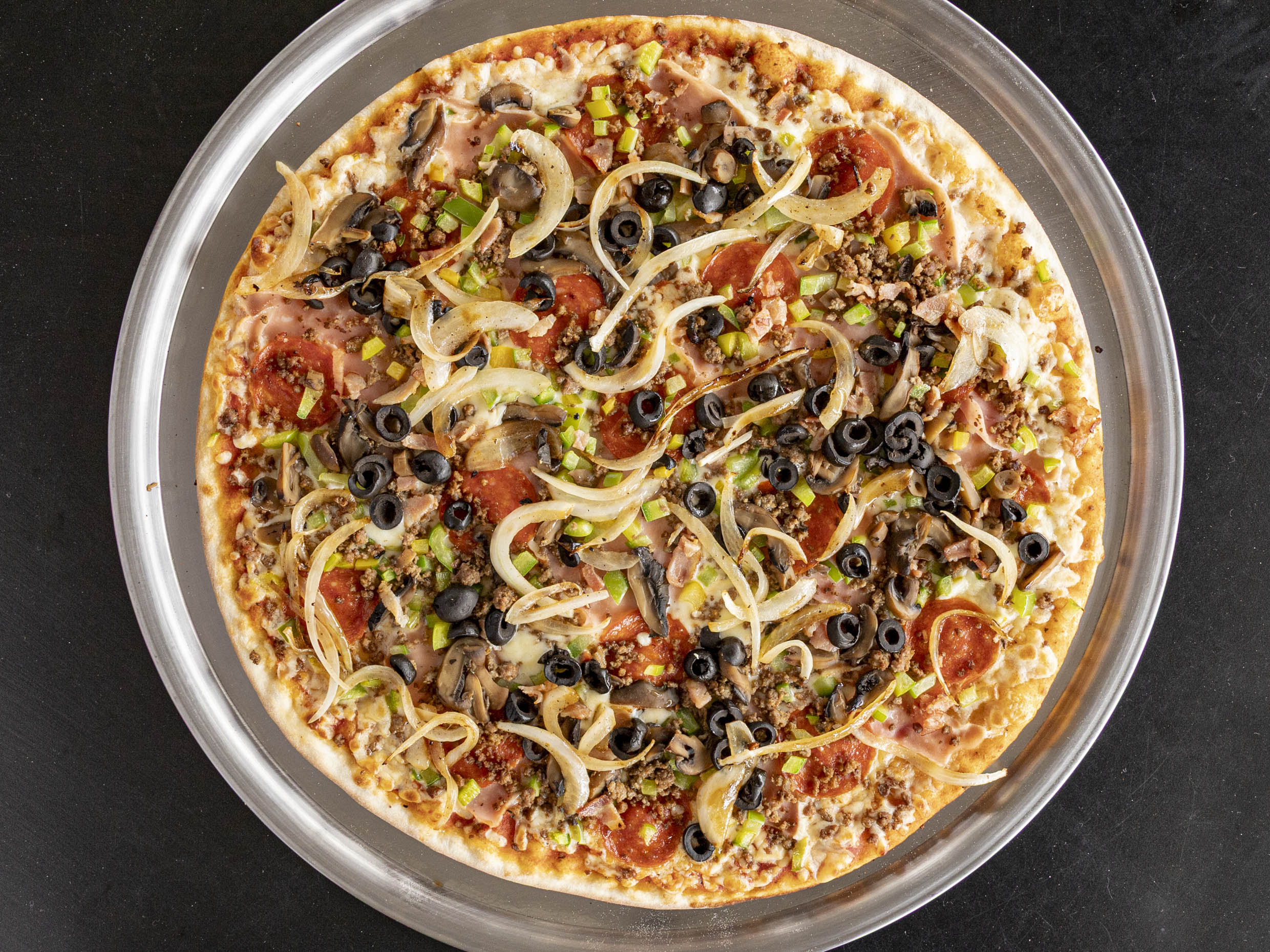 Jamon, Champiñon, Carne molida, tocino, aceituna negra, Pto. Morron, Cebolla asada, y peperoni