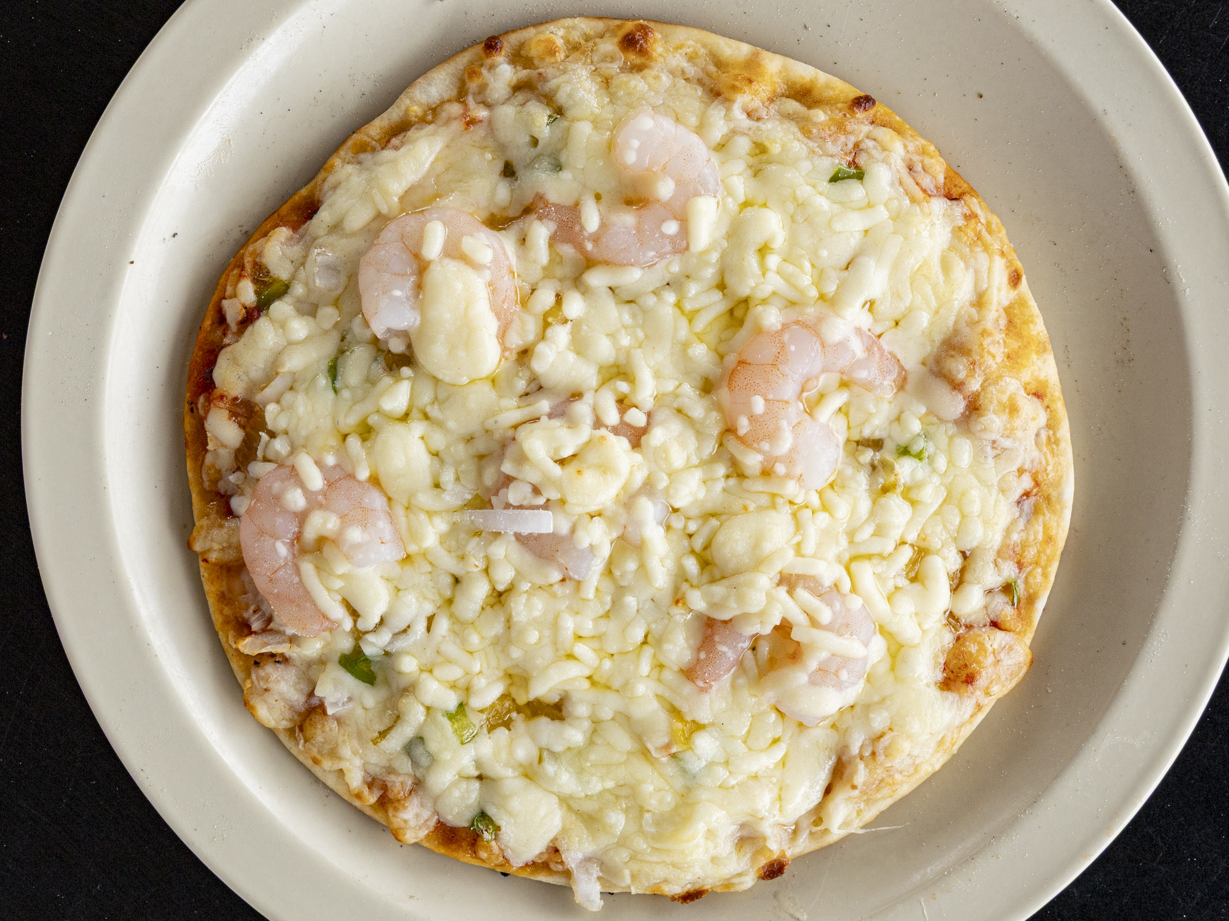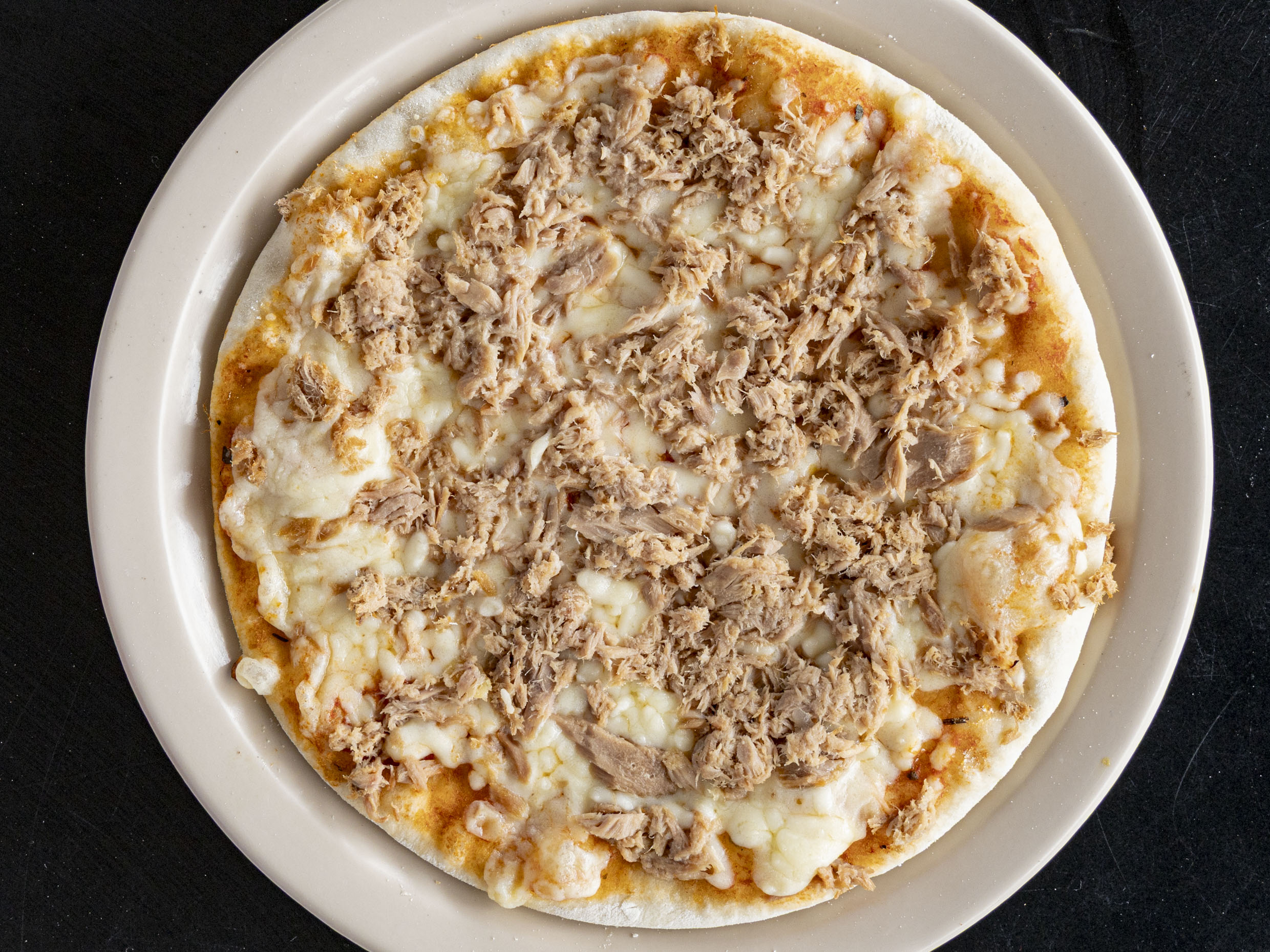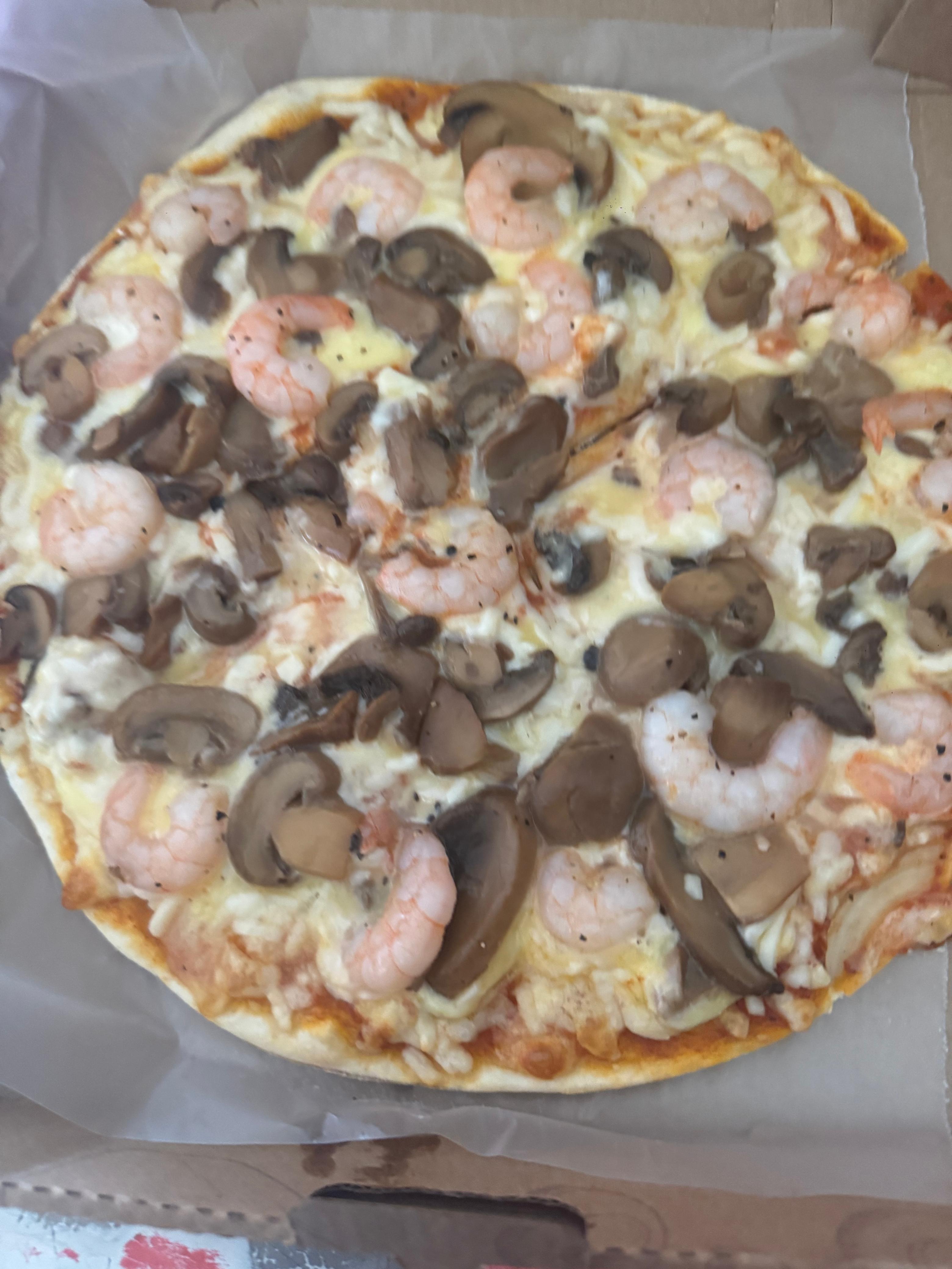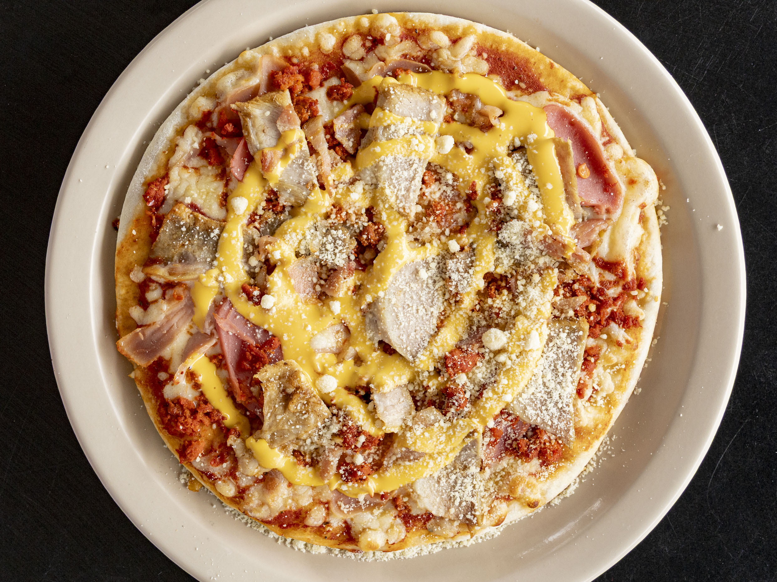 Jamon, Champiñon, Carne molida, tocino, aceituna negra, Pto. Morron, Cebolla asada, y peperoni