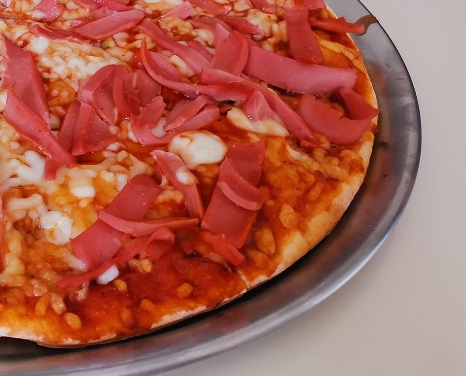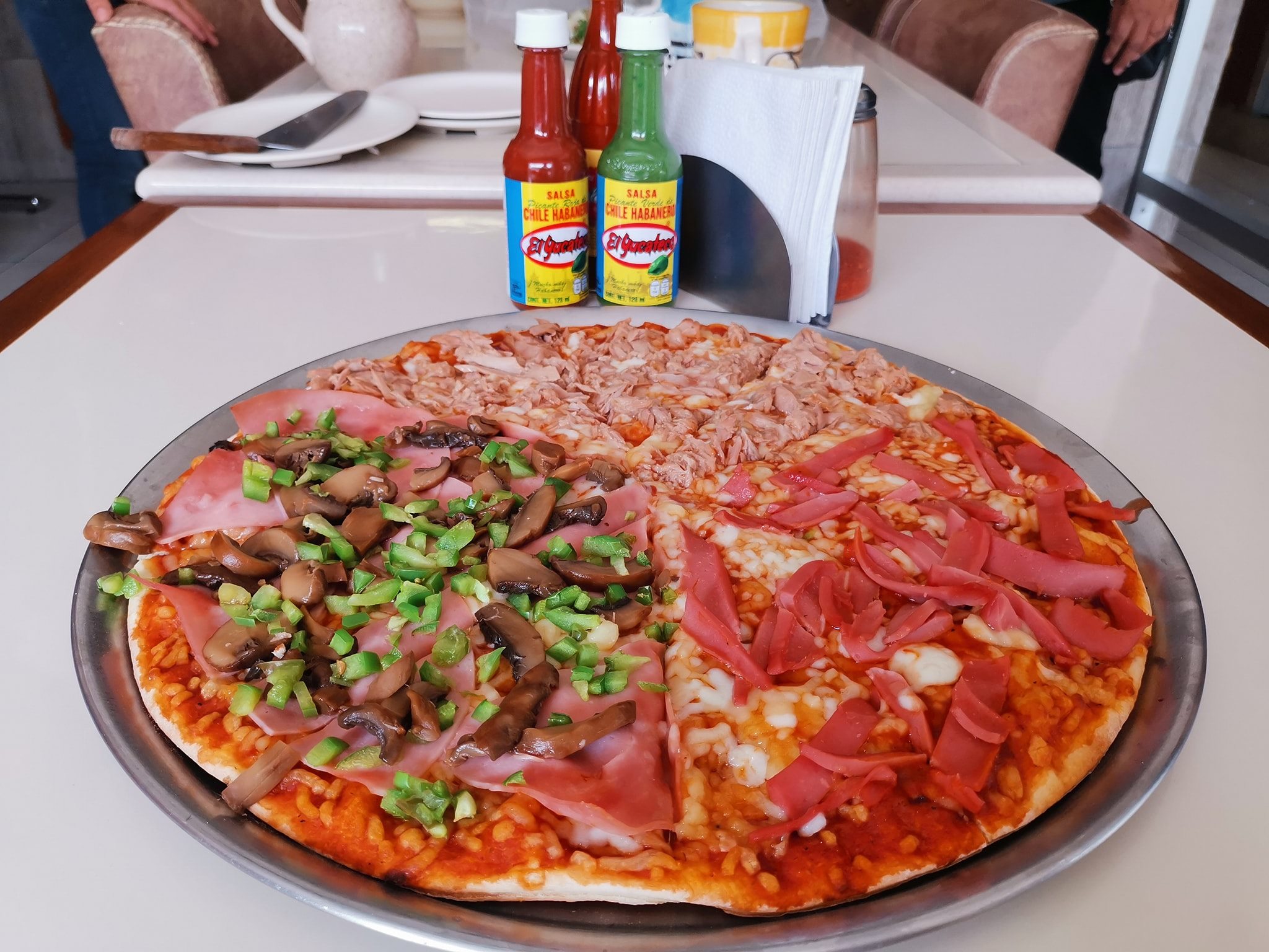 Jamón, salami, champiñón, morrón, cebolla, piña, salchicha y doble queso.