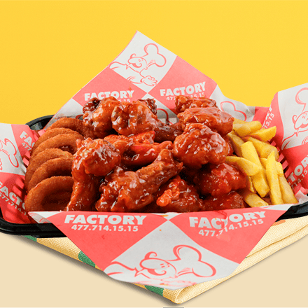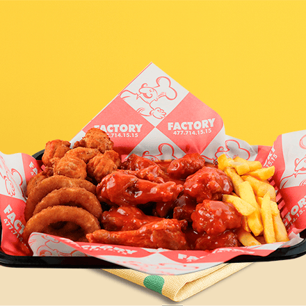 10 pz de alitas, 10 pz de boneless, bañados en tu salsa preferida, con 200 gr de papas a la francesa y 6 aros de cebolla.