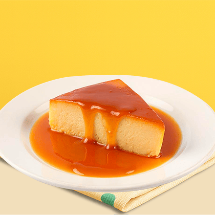 Rebanada de Flan napolitano cremoso con suave sabor a vainilla y toque de caramelo.