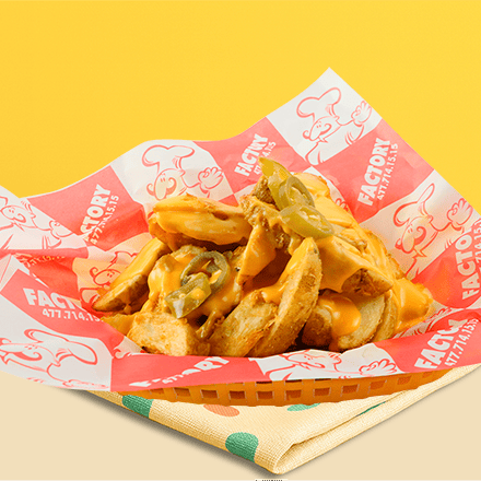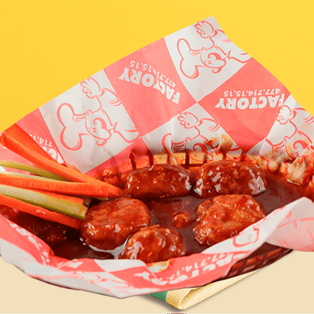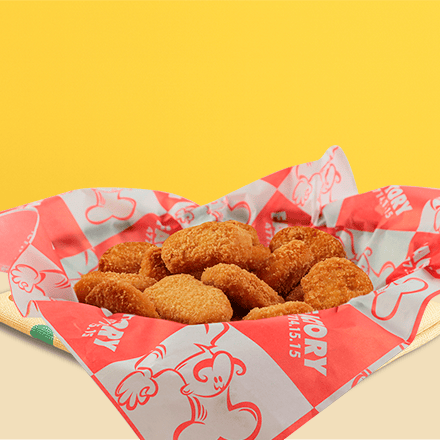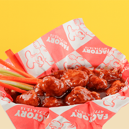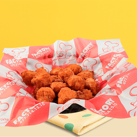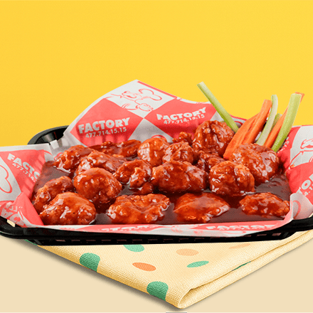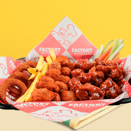 4 alitas, 4 boneless, bañados de tu salsa favorita, 4 nuggets, 12 palomitas de pollo, 200 gr de papas a la francesa y 4 aros de cebolla