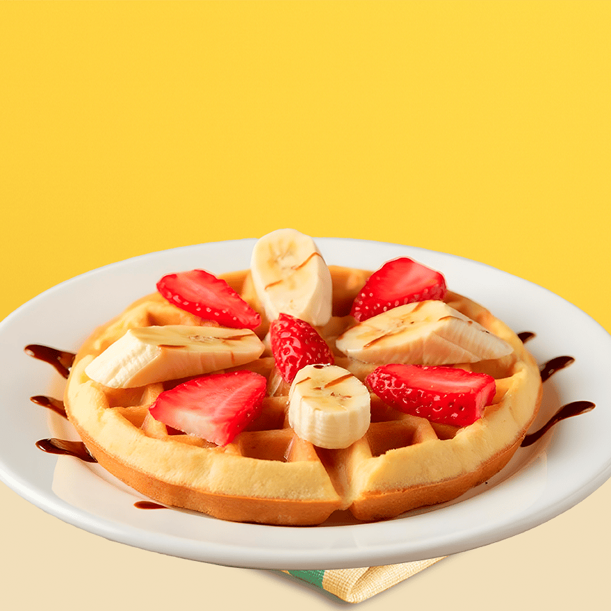 Un waffle preparado con nuestra deliciosa receta de la casa, acompañado con plátano y fresa bañado con chocolate o mermelada, o miel maple